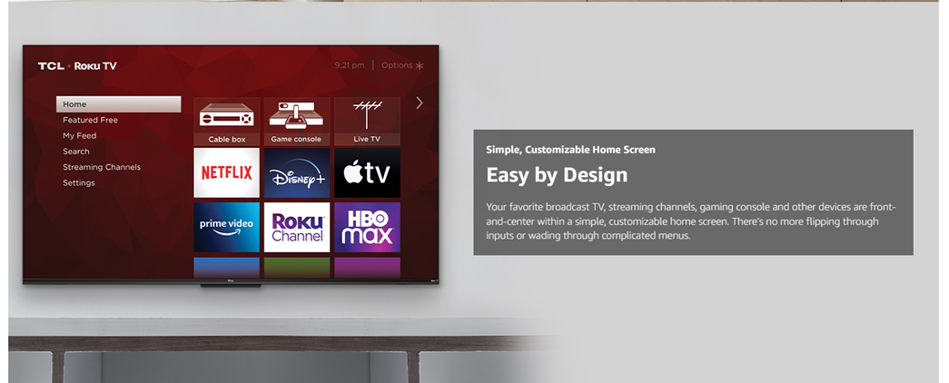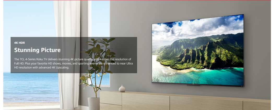 The 4-Series TCL Roku TV offers stunning 4K picture quality with four times the resolution of Full HD for enhanced clarity and detail, as well as endless entertainment with thousands of streaming channels. High dynamic range (HDR) technology delivers bright and accurate colors for a lifelike viewing experience. In addition, your favorite HD shows, movies, and sporting events are enhanced to near Ultra HD resolution with 4K Upscaling. Your favorite broadcast TV, streaming channels, gaming console and other devices are front-and-center within a simple, customizable home screen. There’s no more flipping through inputs or wading through complicated menus. The super-simple remote—with about half the number of buttons on a traditional TV remote—puts you in control of your favorite entertainment and includes one-touch shortcuts to popular channels like Netflix.