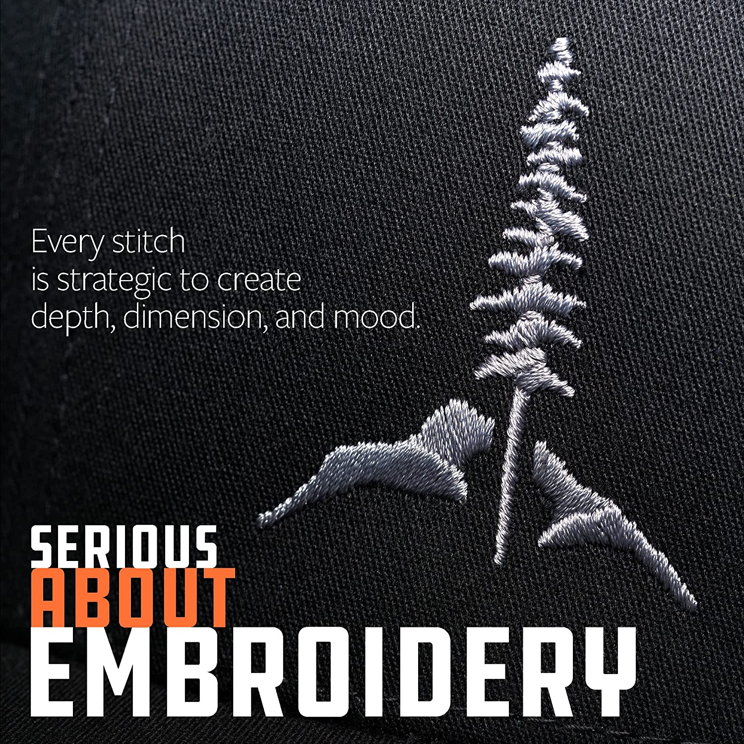 At Larix Gear we are serious about embroidery. Every Larix hat is embroidered right here at our shop in Columbia Falls Montana by us. It's our highest priority to achieve outstanding results by using the most advanced sewing technology and techniques available today. We have chosen Pacific Headwear 104c Richardson 112 and Yupoong 6606 models as our base trucker hats for the Larix designs. We believe these hats represent the best snapback mesh back adjustable retro trucker hats available anywhere. They are very similar to each other in quality fit shape and size. By using these models we can offer a better range of color options and in-stock availability. Not only are we committed to beautiful artwork clean stitching and crisp hats but we also painstakingly remove every visor sticker and more importantly the glue left behind. After removing the visor sticker as well as the glue we brush each hat and use forced air to remove any thread or contaminants that have hitched a ride during the manufacturing process. Then we wrap your Larix hat in tissue paper before placing it in our custom box to keep it clean and safe during its long journey to you. You will immediately understand the level of care and craftsmanship put into your Larix hat upon receiving and opening your box.