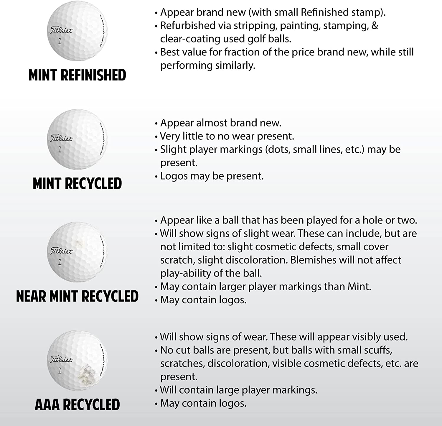 DESCRIPTION! These (5A) recycled golf balls will appear almost brand new. however, they will have very little to no wear present. Slight player markings (dots, small lines, etc) may be present. Logos may be present as well. These balls have been cleaned repackaged. The feel of these golf balls is firm with a high range game spin response. A game of golf has never looked better.