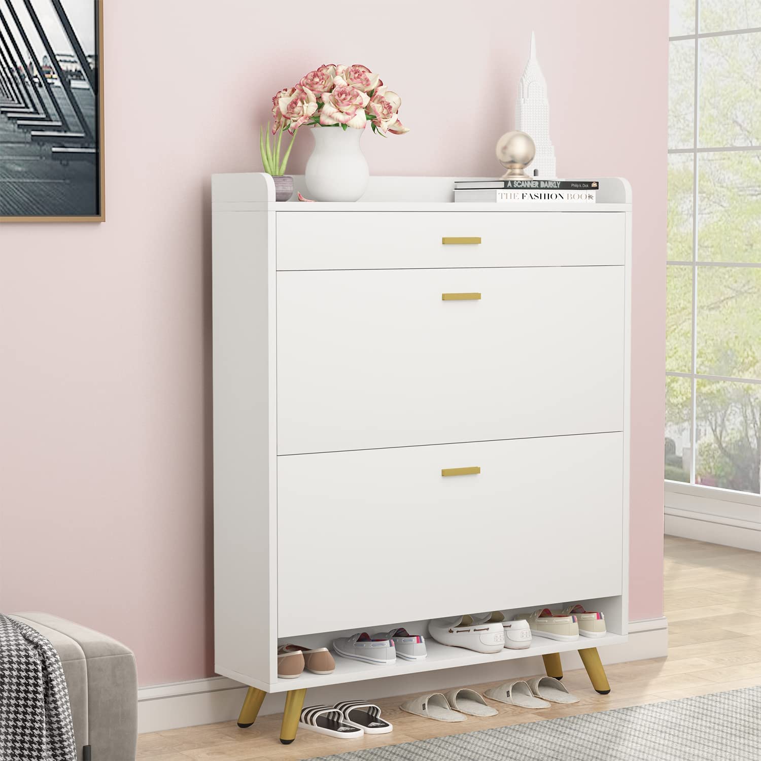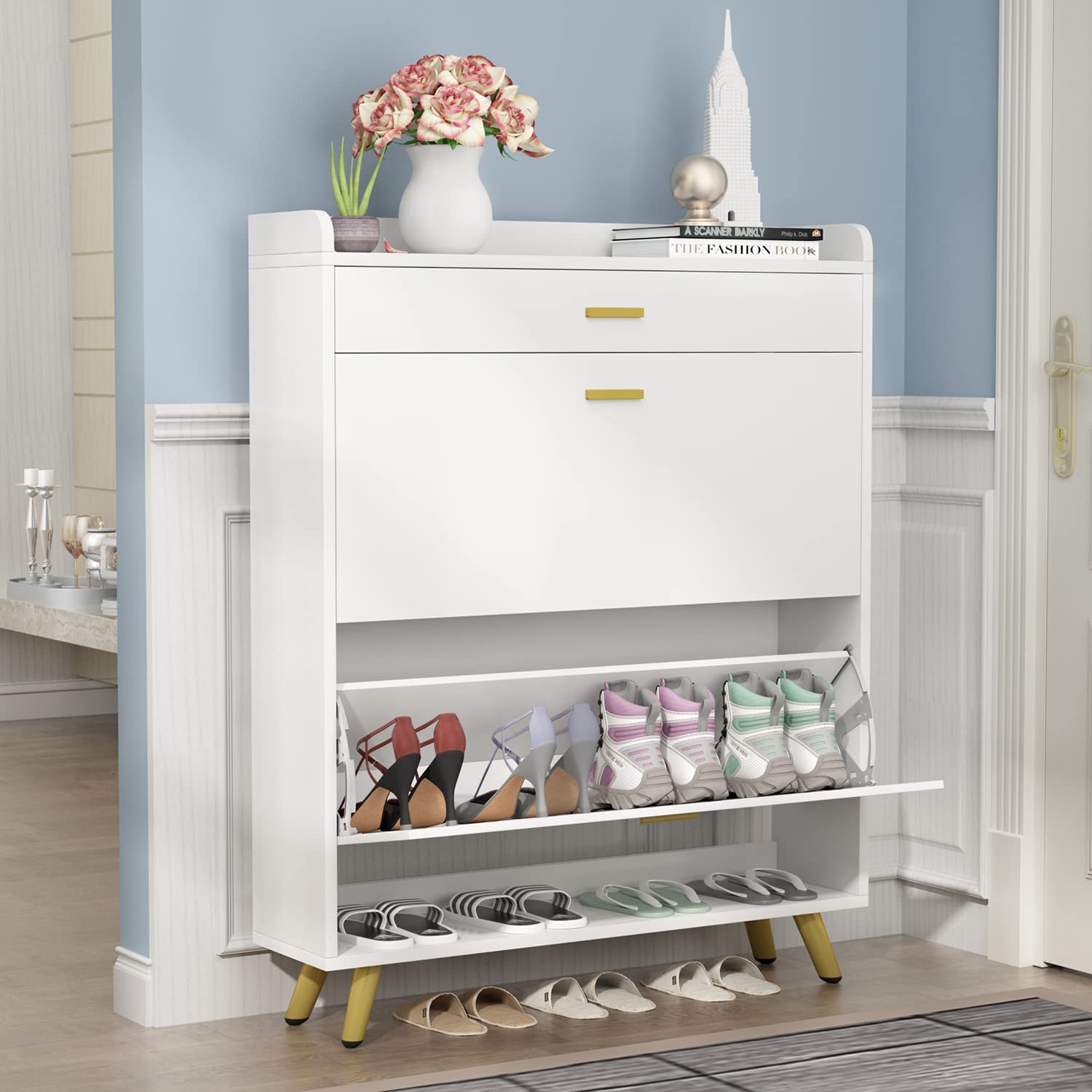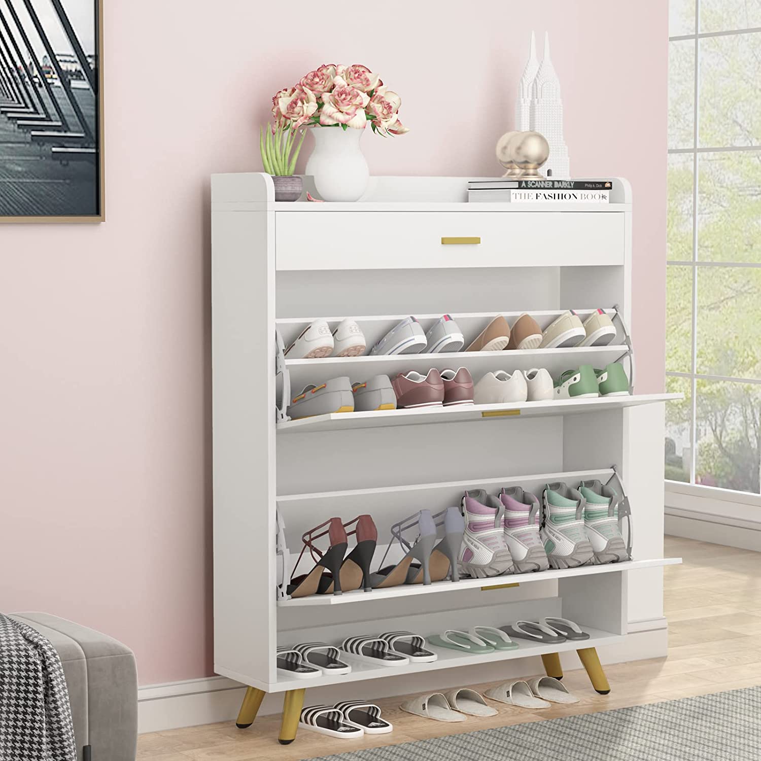 【Strong & Sturdy】 - The shoe storage organizer is made of premium quality manufactured wood. Connotation two fold-out parts are made of iron. The whole shoe cabinet is elegant and sturdy, made to last.