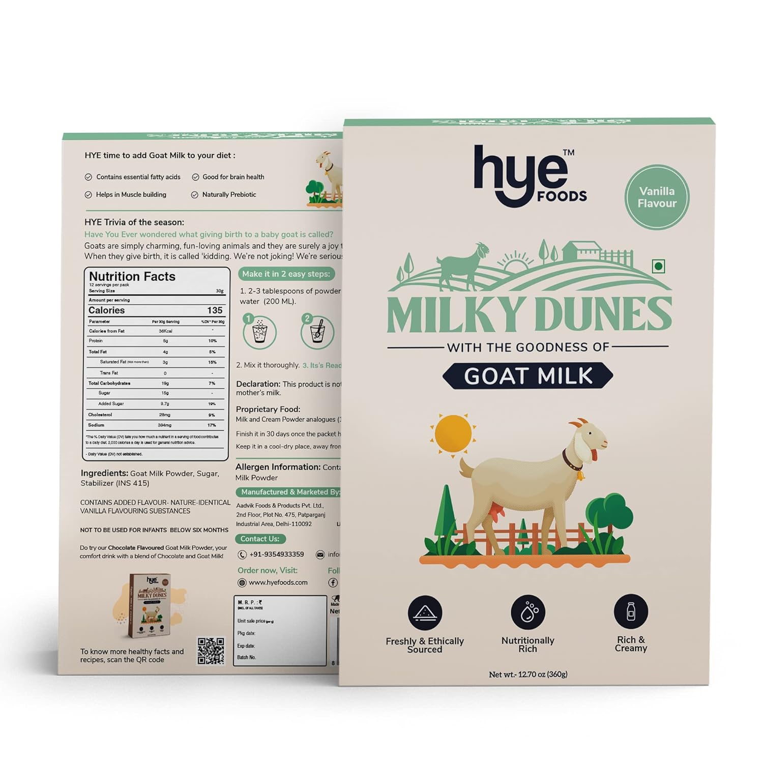 Hye Foods’ Milky Dunes Vanilla Goat Milk Powder is Lab-Tested and Manufactured in FDA, BRC, FSSAI, HACCP, and ISO-Certified plants.