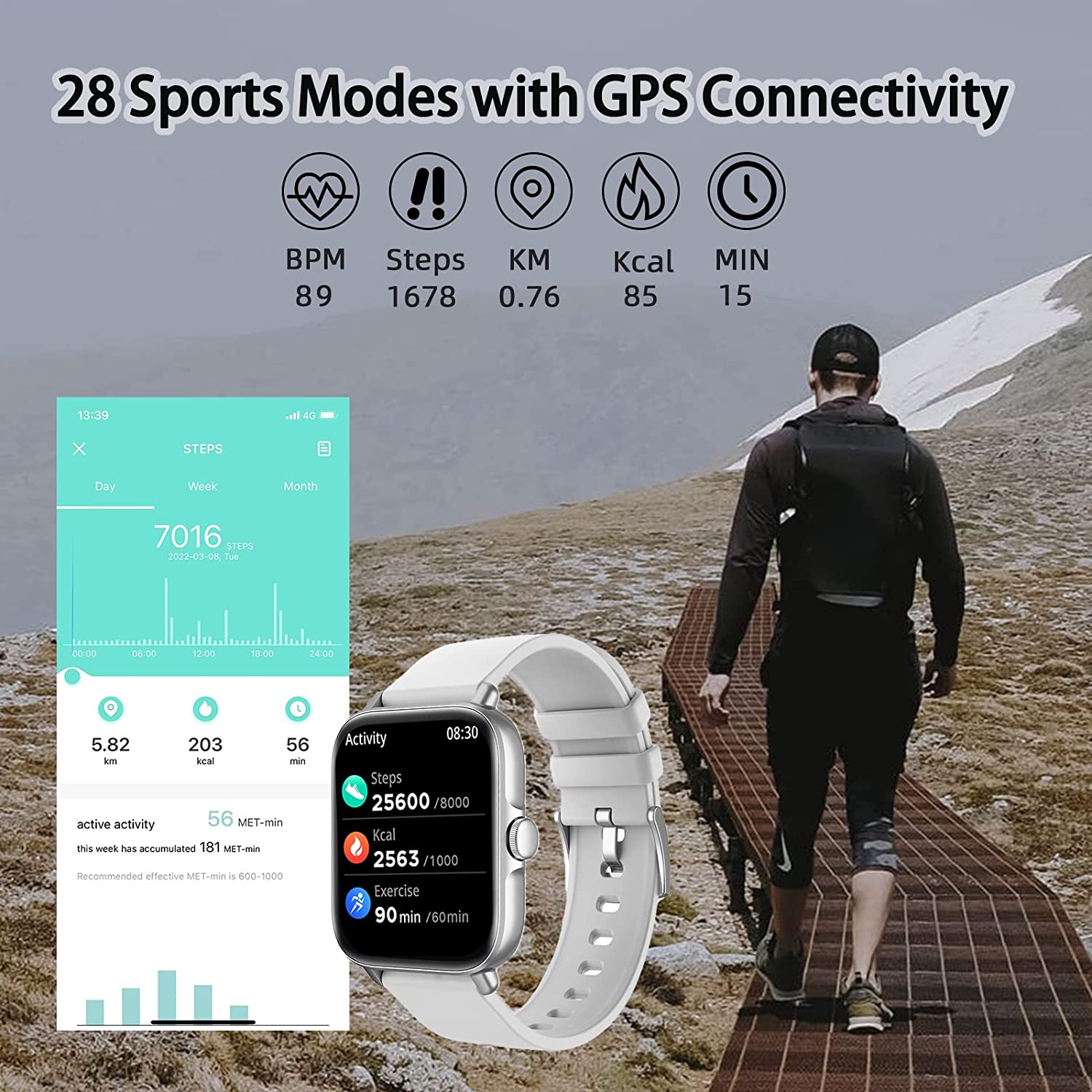 • 【28 Sports Modes Activity Tracker】The fitness watch has 28 sports modes to meet your various sports styles. You can choose the corresponding mode according to your sports (walking, running, skipping, cycling, swimming, badinton, football, yoga, etc). During your exercise, it will record your data like steps, calories burned, distance and active hours in real time. You can check fitness data analysis to help you achieve better exercise results.