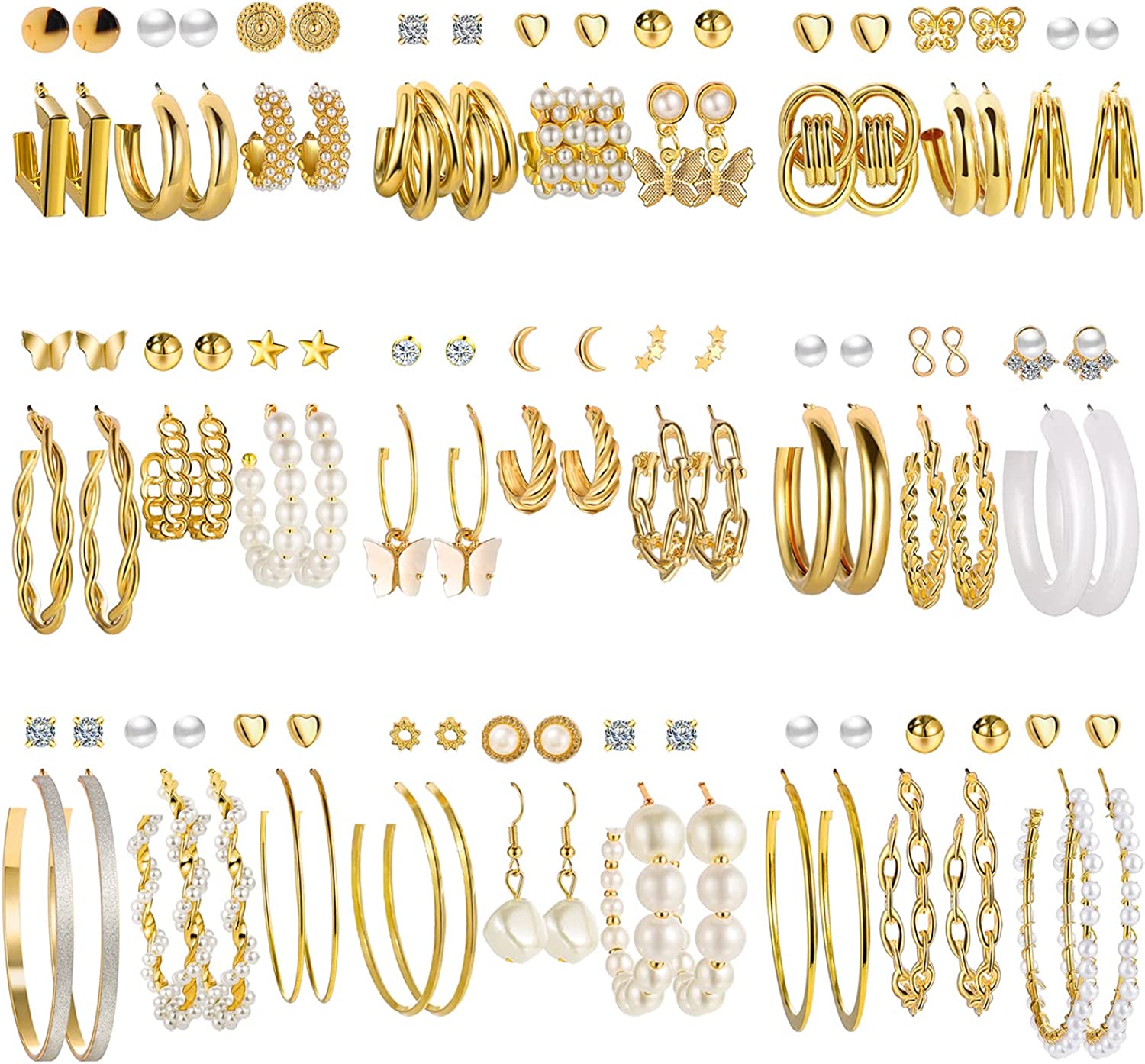 54 Pairs Gold Hoop Earrings Set for Women Multipack, Boho Fashion Statement Stud Hoop Earrings Pack with Pearl Butterfly Shaped Assorted Small Big Hoop Earrings Jewelry for Gift