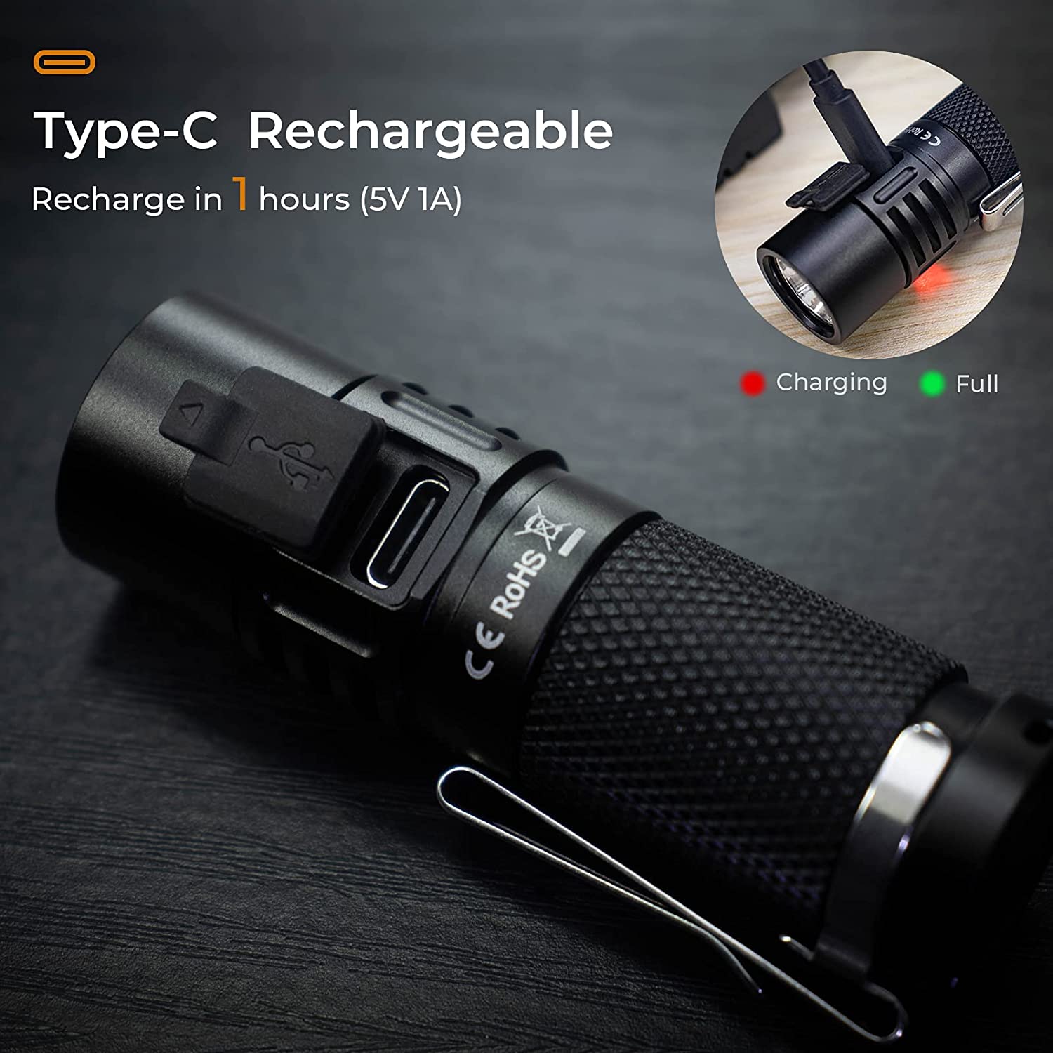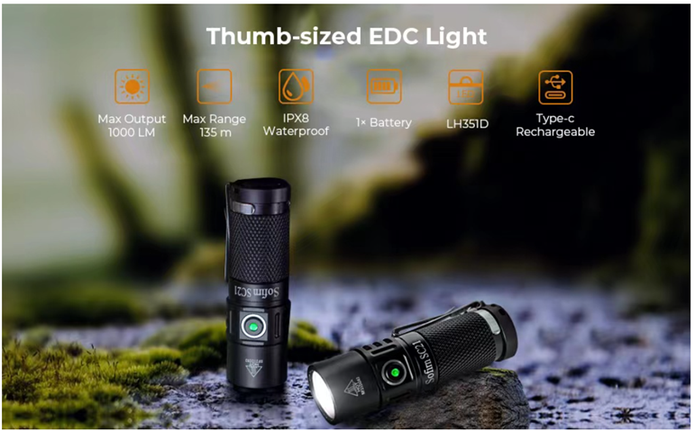 Sofirn SC21 is a small but powerful EDC flashlight for indoor or outdoor use. It features a USB-C port for convenient recharging, a high efficiency DTP MCPCB board, a super bright LH351D LED with up to 1000 lumens, constant current regulation as well as an improved, stable design.