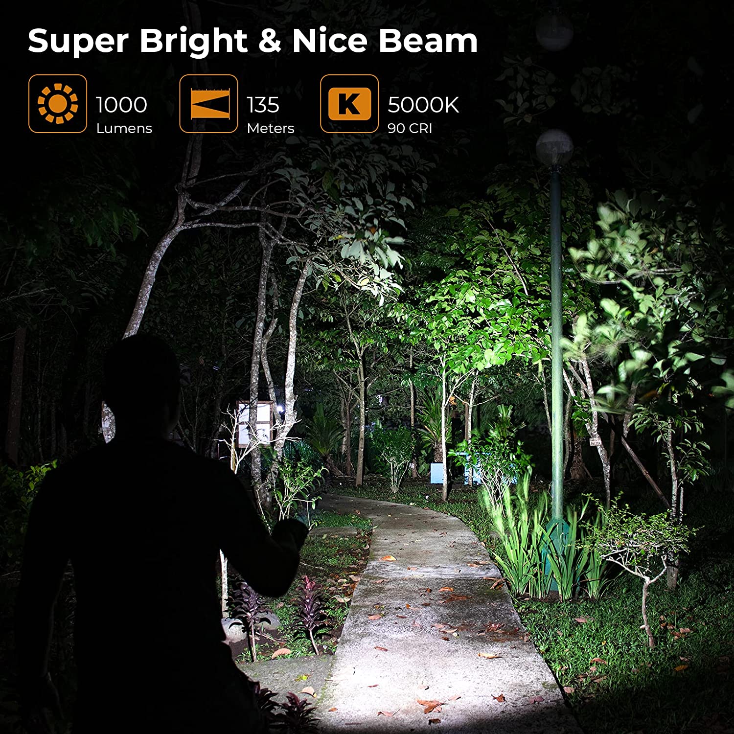 - Mini & Powerful: as small as your thumb finger, the tiny flaslight gives out max 1000 lumens, lighting a large area as football field, beam reaches out 135 meters max. You can attach it with your key ring, use it as edc tool for dog walking, jogging etc.