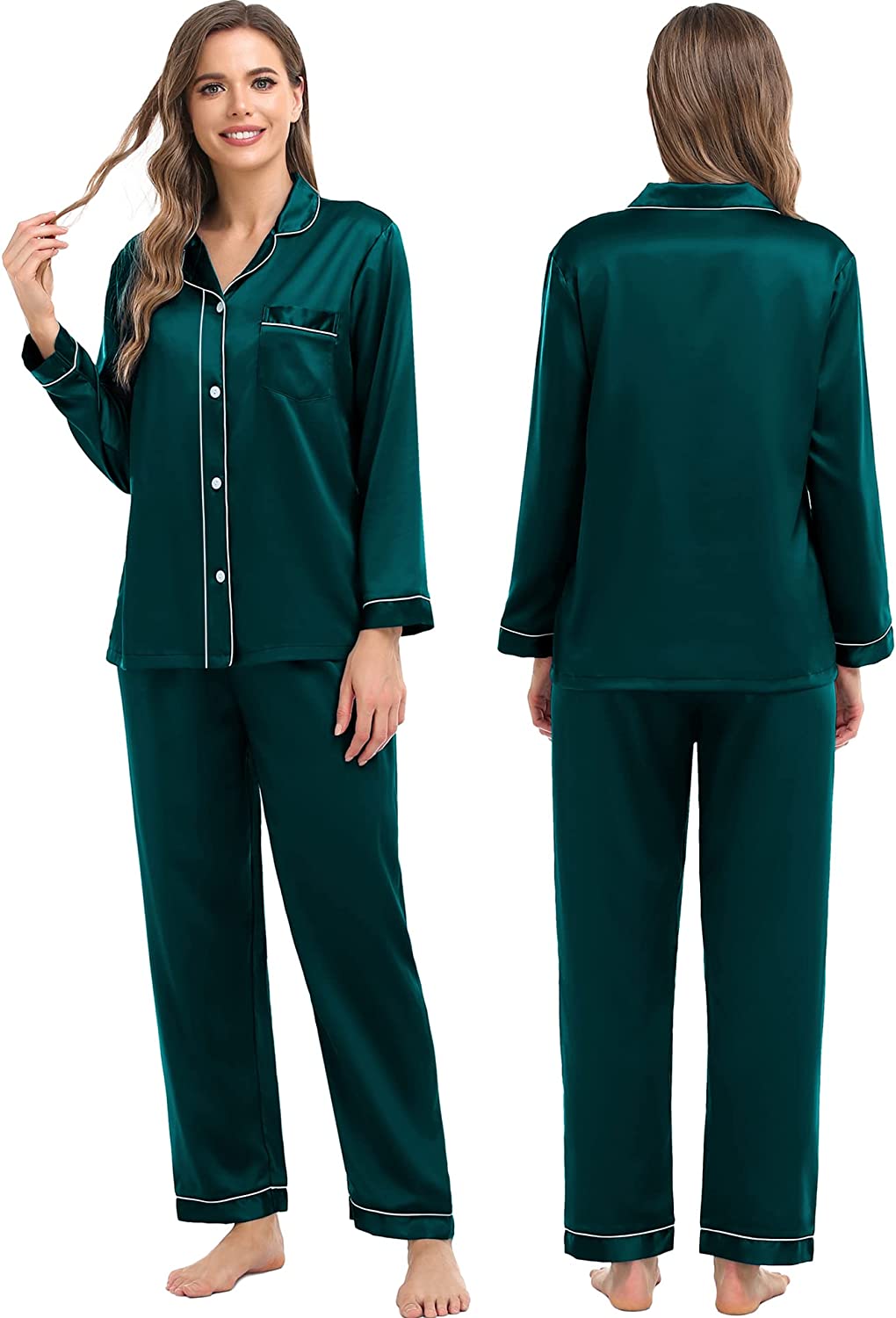 SWOMOG Silk Satin Pajamas Set for Family Button-Down PJs Sets Two-Piece Lounge Sets Long Sleeve White Sleepwear