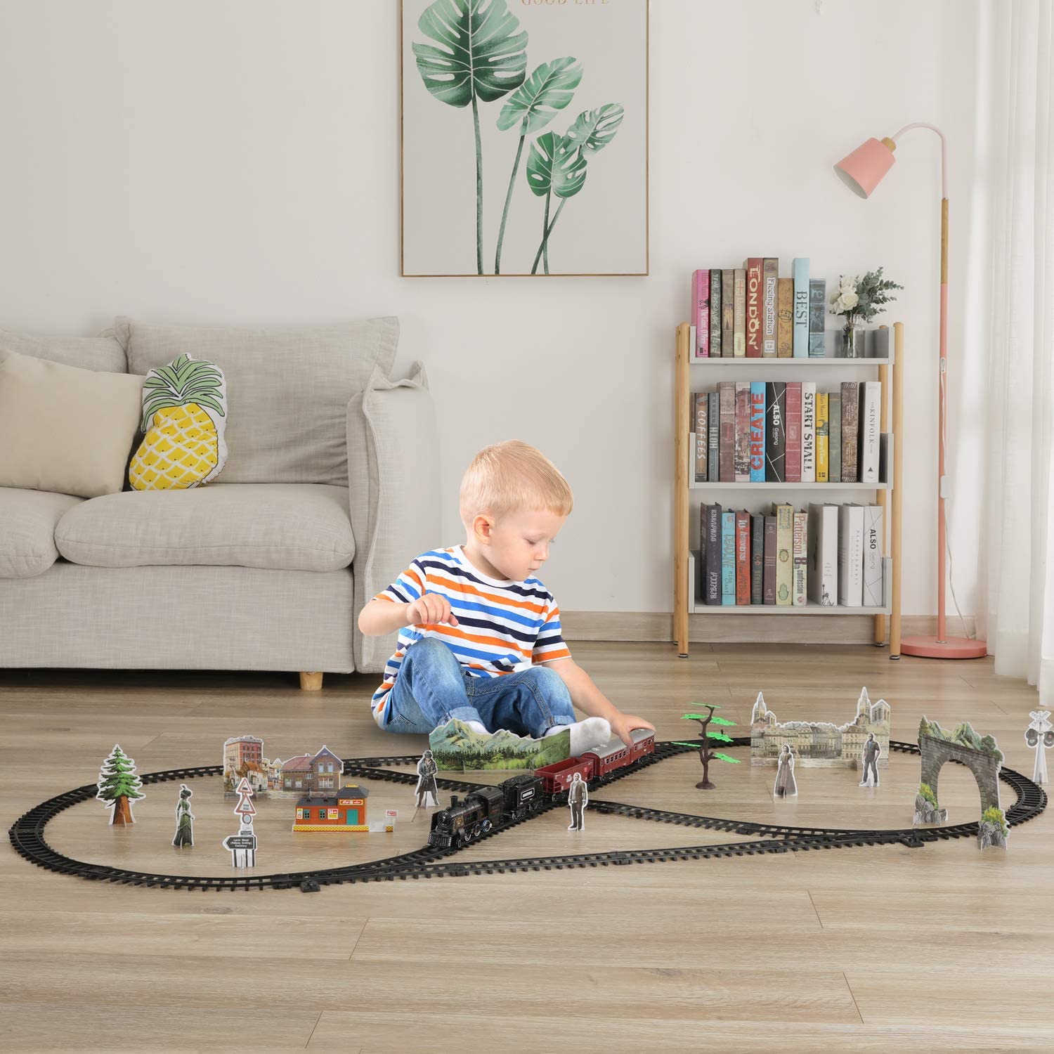 - You will play in any occasions: is fit for most family Christmas trees and any table during Festival ,Assemble the modular rail track parts into your own railroad shape and layout,then place the hooked train sets on the tracks precisely, finally turn on the switch, the train set will move on the track steadily, smoothly. Great gift for birthday and christmas gift for boys & girls.