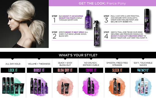 • Boost It Volume Inject Mousse infused with thickening agents, hair is boosted for a long lasting, bouncy and volumized look