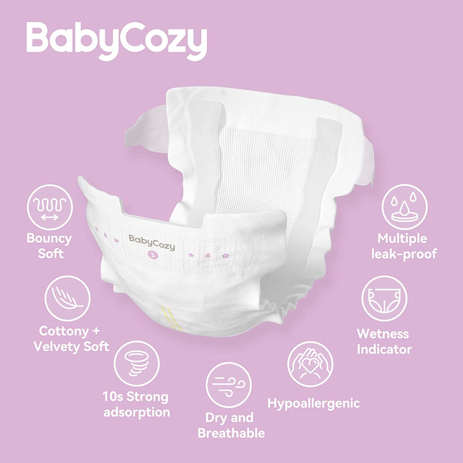 • ?【Velvety+Cottony 2X Bouncy Soft】Not only does the softness combo come from cotton fabric, but also from a velvety soft fabric. With the lightest 0.8D fabric density and 10 microns fiber which is 10 times smaller than hair, Babycozy disposable diapers barely leaves any scratch on the skin, greatly cutting the risk of baby tushy allergy or rash. Ultra soft-touch diapers are baby essentials for newborn which designed to bring the most velvety feel to baby’s skin in the gentlest way