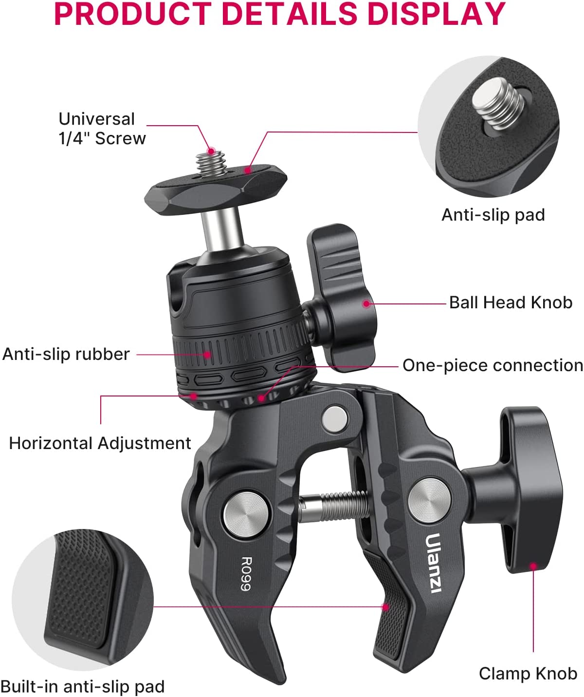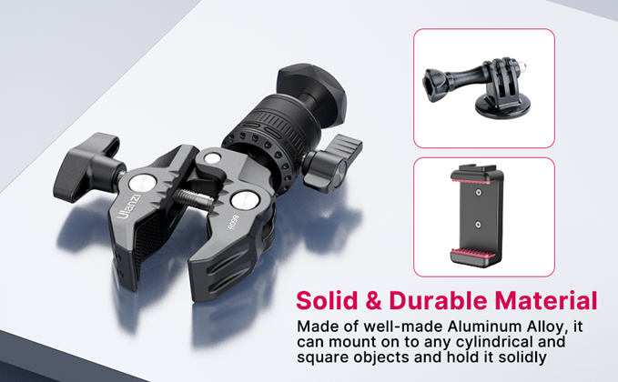 • Super Clamp: the open width of the super clamp ranges for 0.59in(15mm) to 2.3inch(60mm), which can help you fix the accessories on 2.3inch(60mm) rods/desktop. The super clamp enable you to add one more mounting position on desk/pole/tripod leg/camera cage/DJI Pole