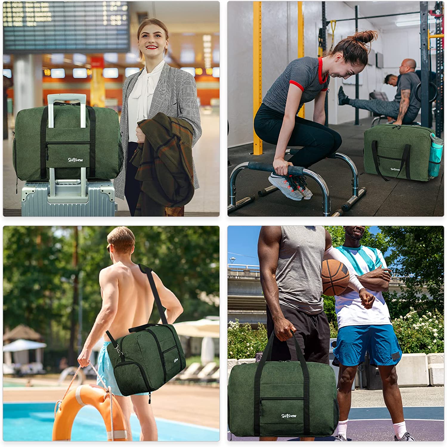• 3 Carrying Options: over your shoulder, behind your back or by the bag's dual handles. You can use it as a sports gym bag, a carry on bag, a travel bag and a daily bag, perfect for workout, rides, gym, yoga, beach, pool, camping, practice days or weekend trips