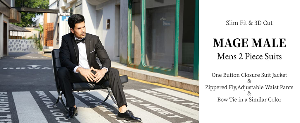 - 【Classic Style】BLAZER:Single button closure,notched lapel collar with colorblock design,double vents,one chest pocket with white trim,two side flap pockets,inside pockets;PANTS:Flat front,zipper fly,button end and adjustable waist tab,two front slash pockets,two back welt pockets with buttons;BOW TIE:Match with a satin bow tie in a similar color.