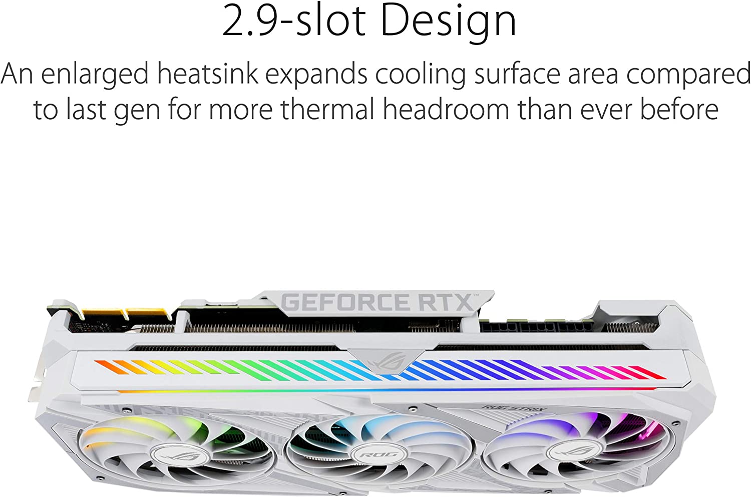 The ROG STRIX GeForce RTX™ 3090 White OC Edition 24GB GDDR6X adds to the NVIDA Ampere Architecture with a white color scheme, Axial-tech fan design, 0dB technology, 2.9-slot Design, Dual BIOS, Auto-Extreme Technology, SAP II, MaxContact Technology, and more.