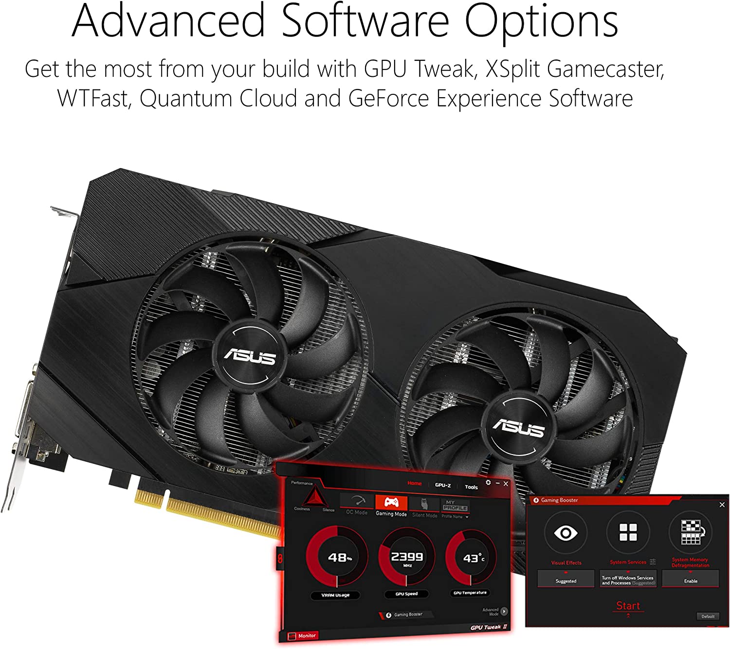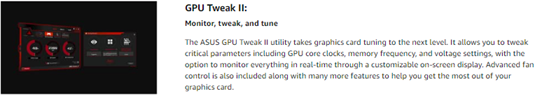 • Gpu Tweak II makes monitoring performance and streaming in real time easier than ever, and includes additional software like Game Booster, XSplit Gamecaster, WTFast and quantumcloud