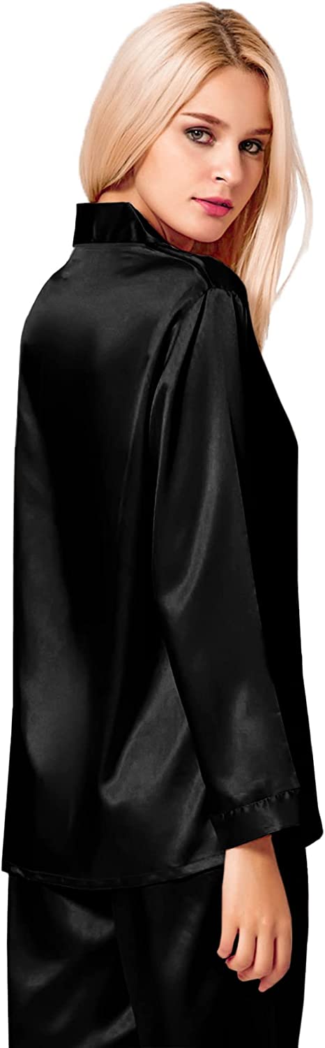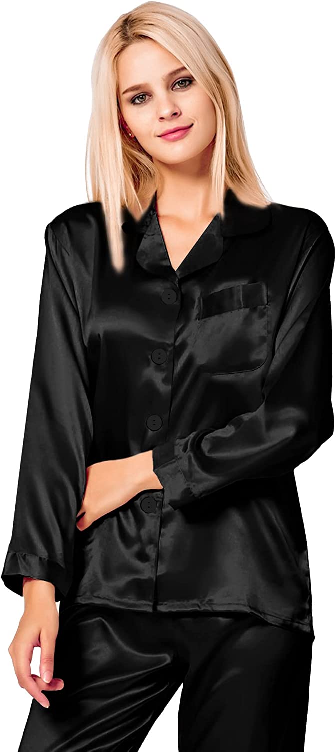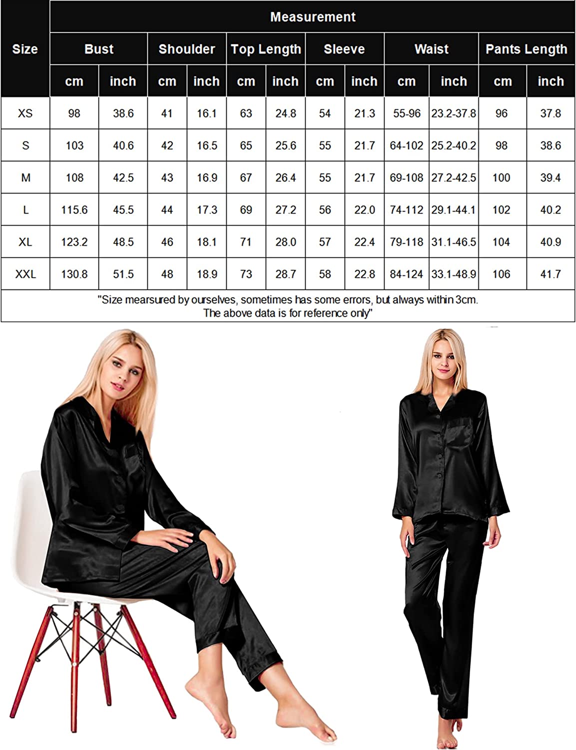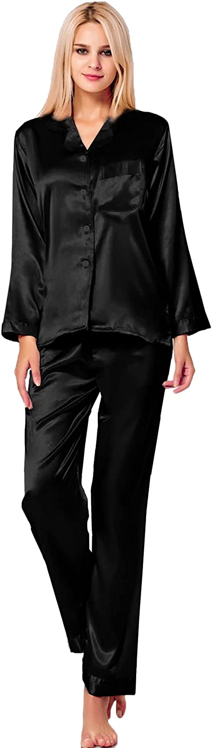 • ❤ Classic Design --- Womens satin pajama set featuring classic sleepwear style:long sleeve button down shirt and long lounge pants.The ergonomic H-shaped loose design give you the ultimate comfort. Button front design make it easy to get on and off. And the notch collar top hits at hips.Pants with soft elastic waist, makes you feel relaxed and comfortable.The chest pocket allows you to store some small stuff.This satin pajamas are lightweight and cozy for nightsleep.