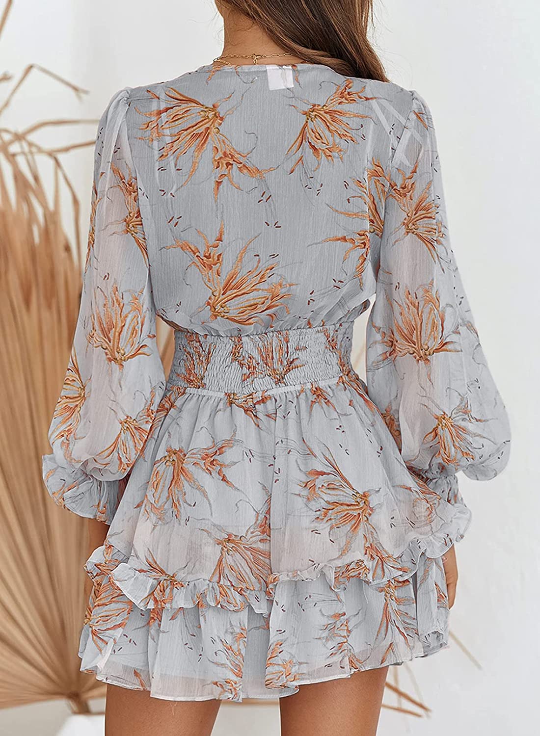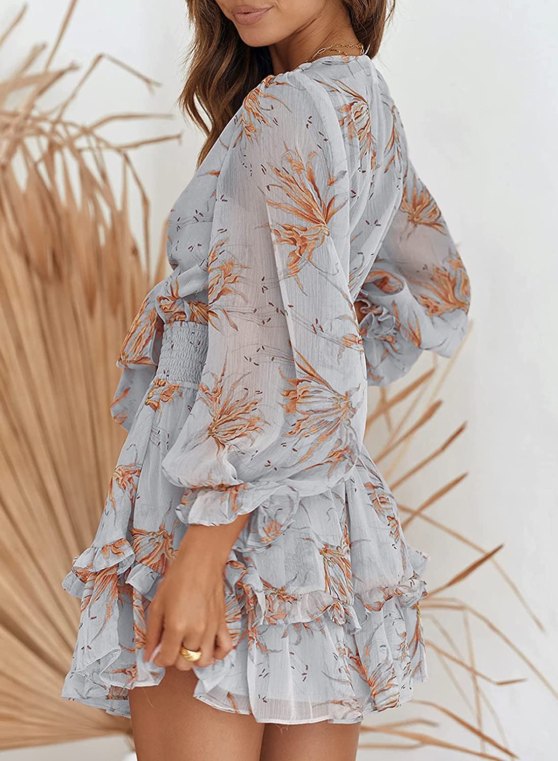AlvaQ Womens Spring Summer Knot Front V Neck Ruffles Long Sleeve Floral Print Swing Mini Dress