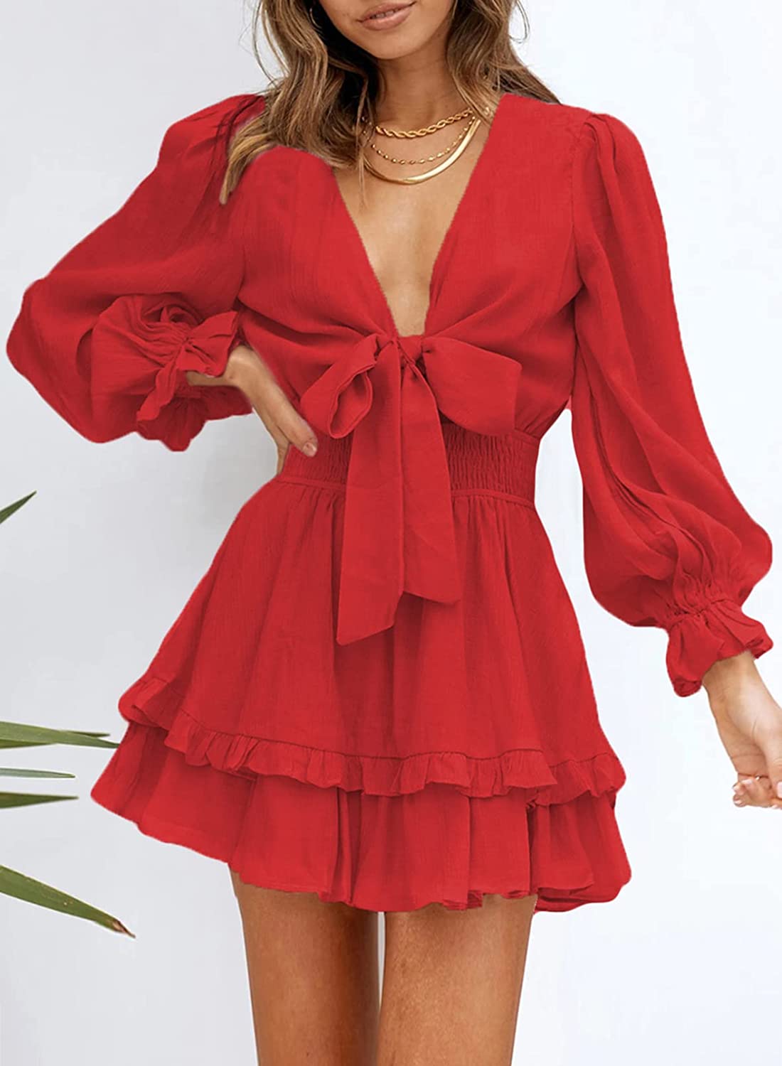 • Features: Vintage Solid/ Floral Print Dress,Sexy Deep V-neck,Cut Out Tie Knot Front,Long Puff Sleeve,High Wiast,A Line Silhouette, Short Knee Length,Casual,Bohemian,Flowy Beach Dress.
