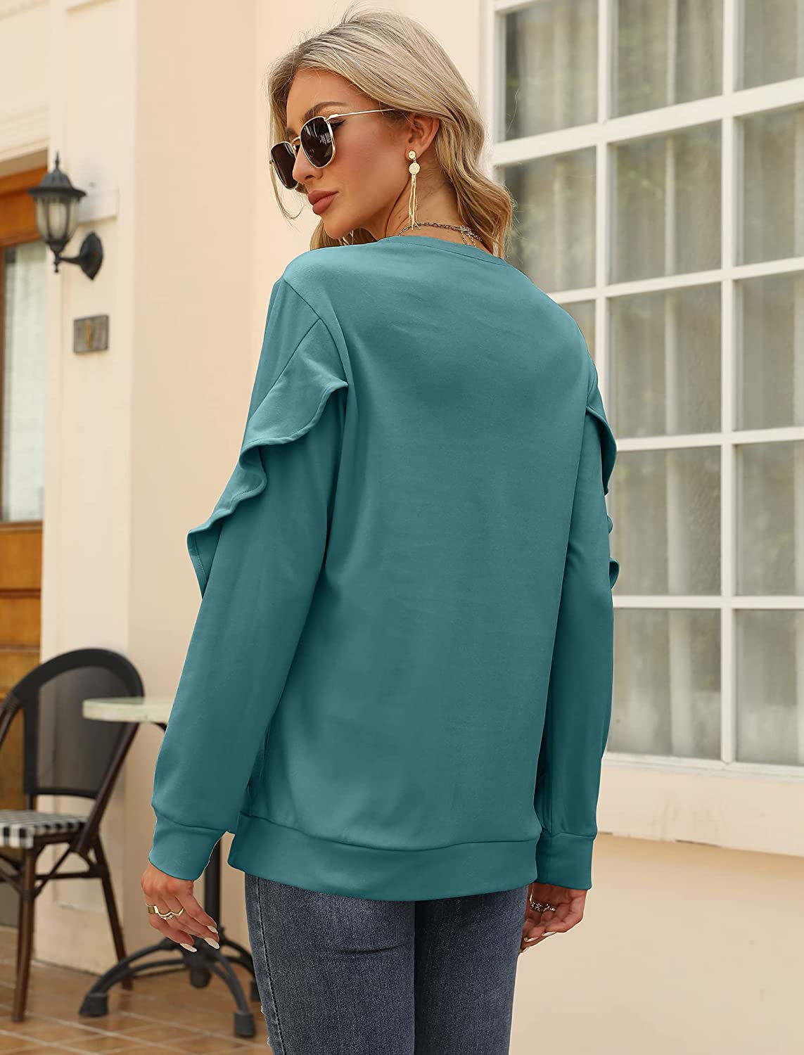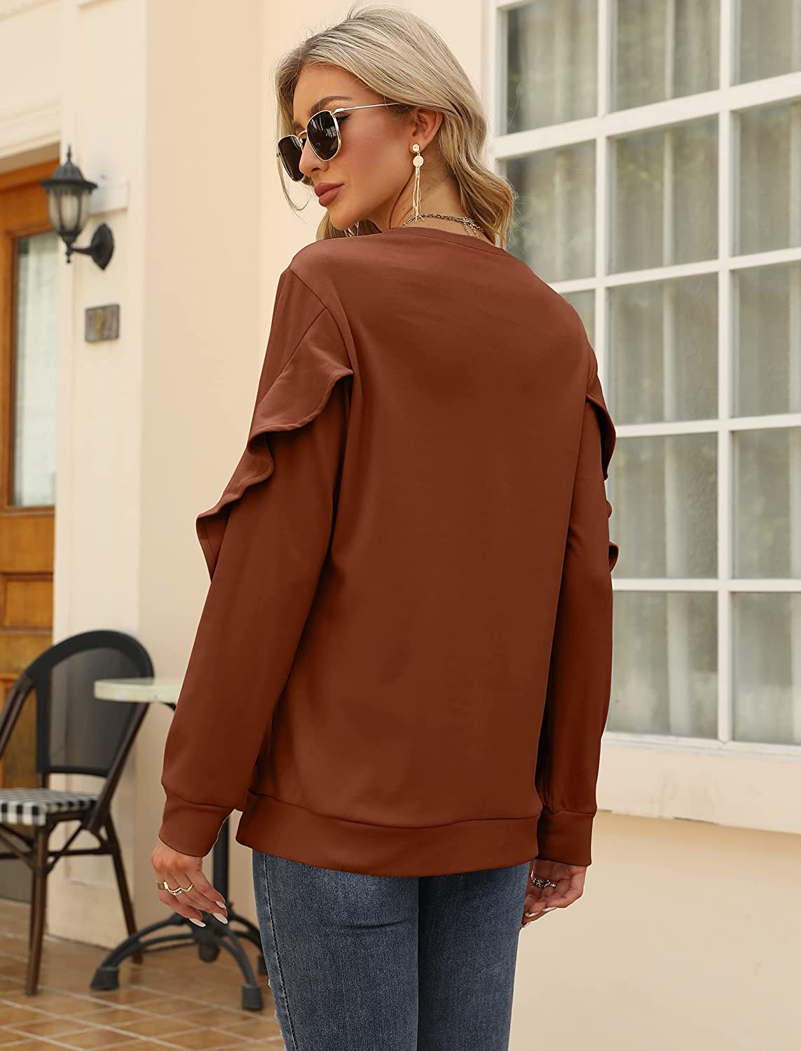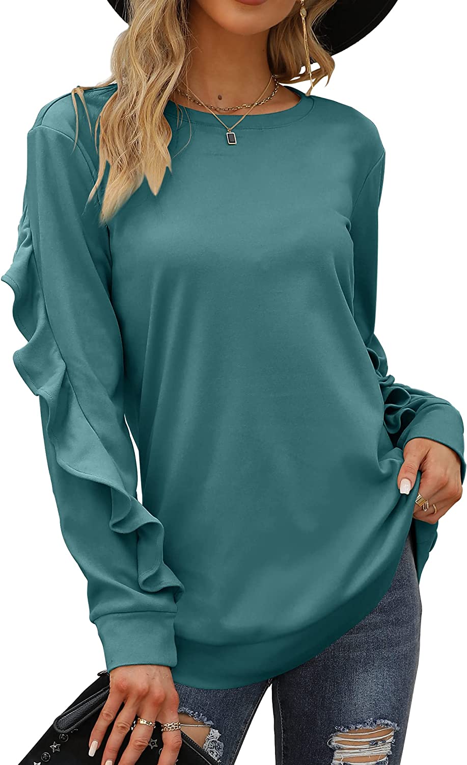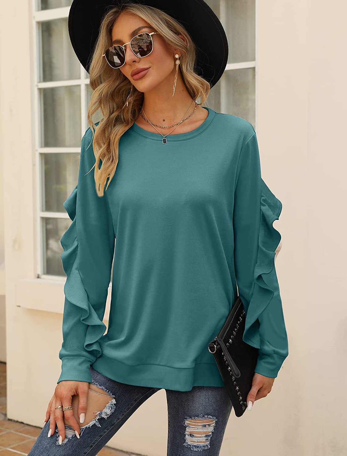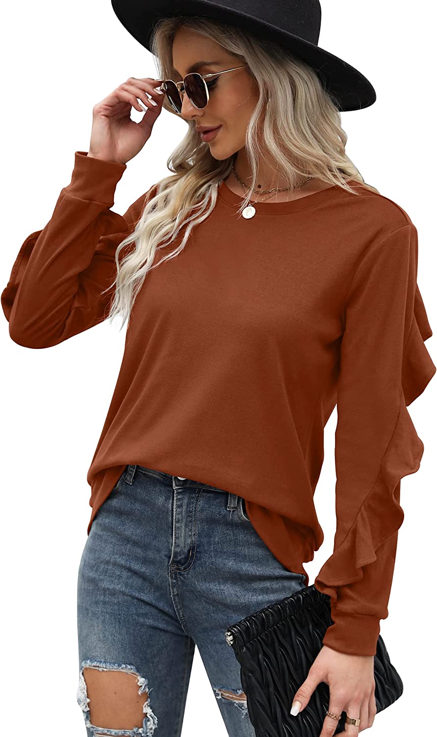 • ✦Design: Saloogoe trendy crewneck sweatshirt with cute ruffle sleeve, banded edges. Casual lightweight sweaters with elastic cuffs, loose sleeve, relaxed Loose fit will be your daily go-to shirts in 2022.