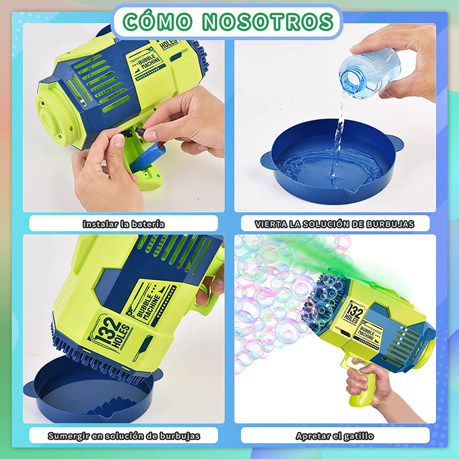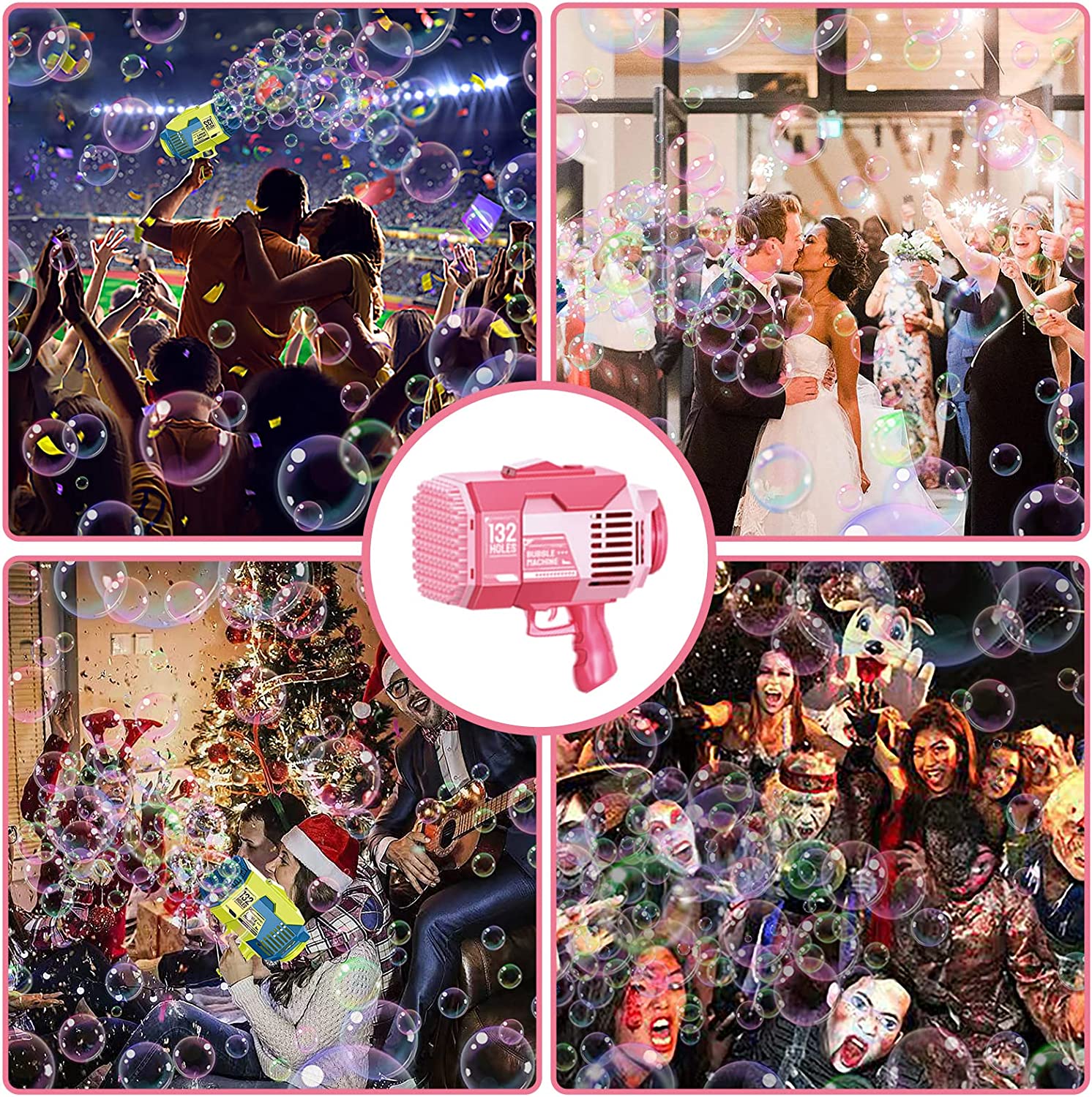 • 【Newly Upgraded 132-Hole Design】- The product includes a 132-hole Bubble Gun, two Bubble Liquid Bottles, 50 concentrated Bubble liquid packets, one sticker, one bubble tray, a rechargeable battery, and a charger. The tray is easy to clean and won't stick to your hands.