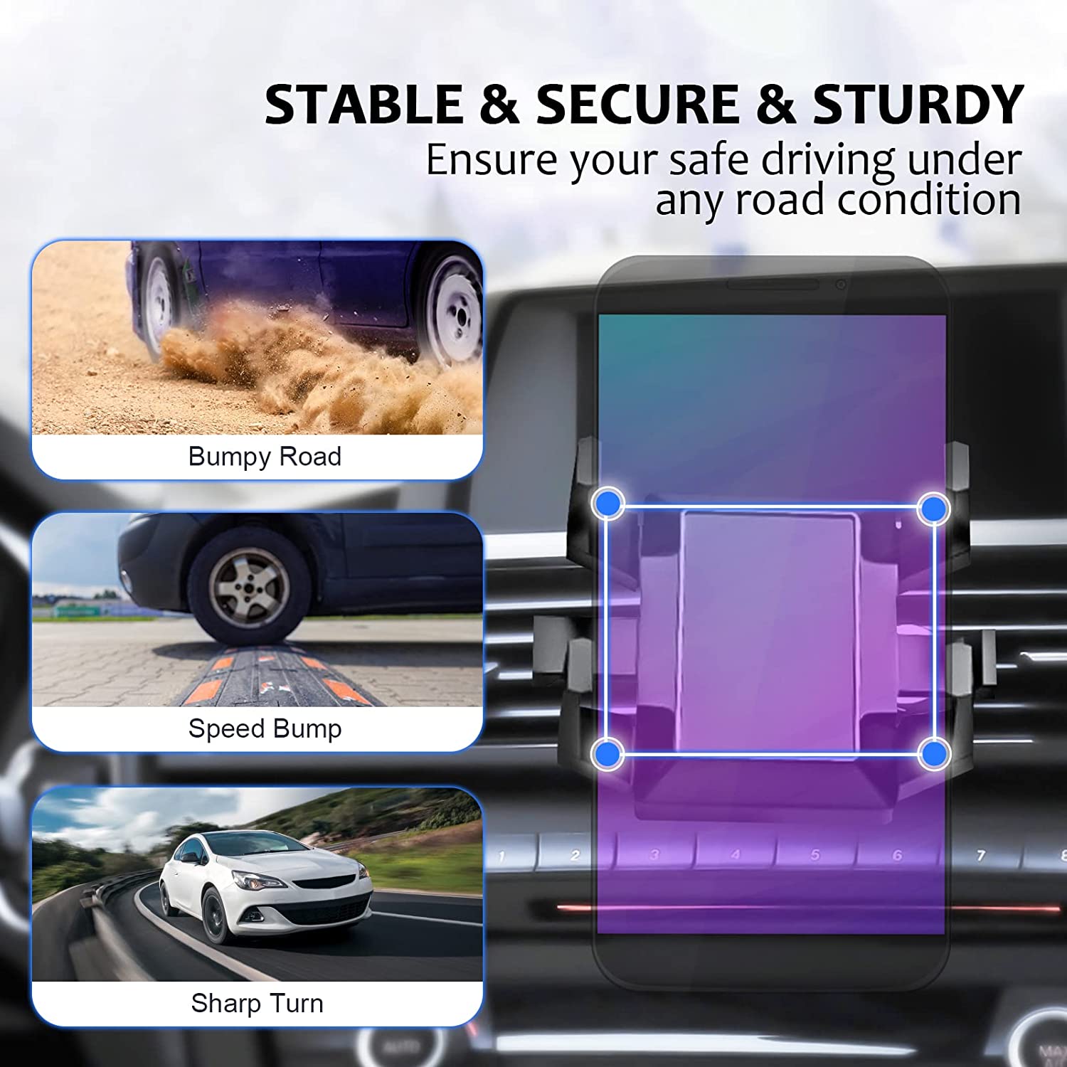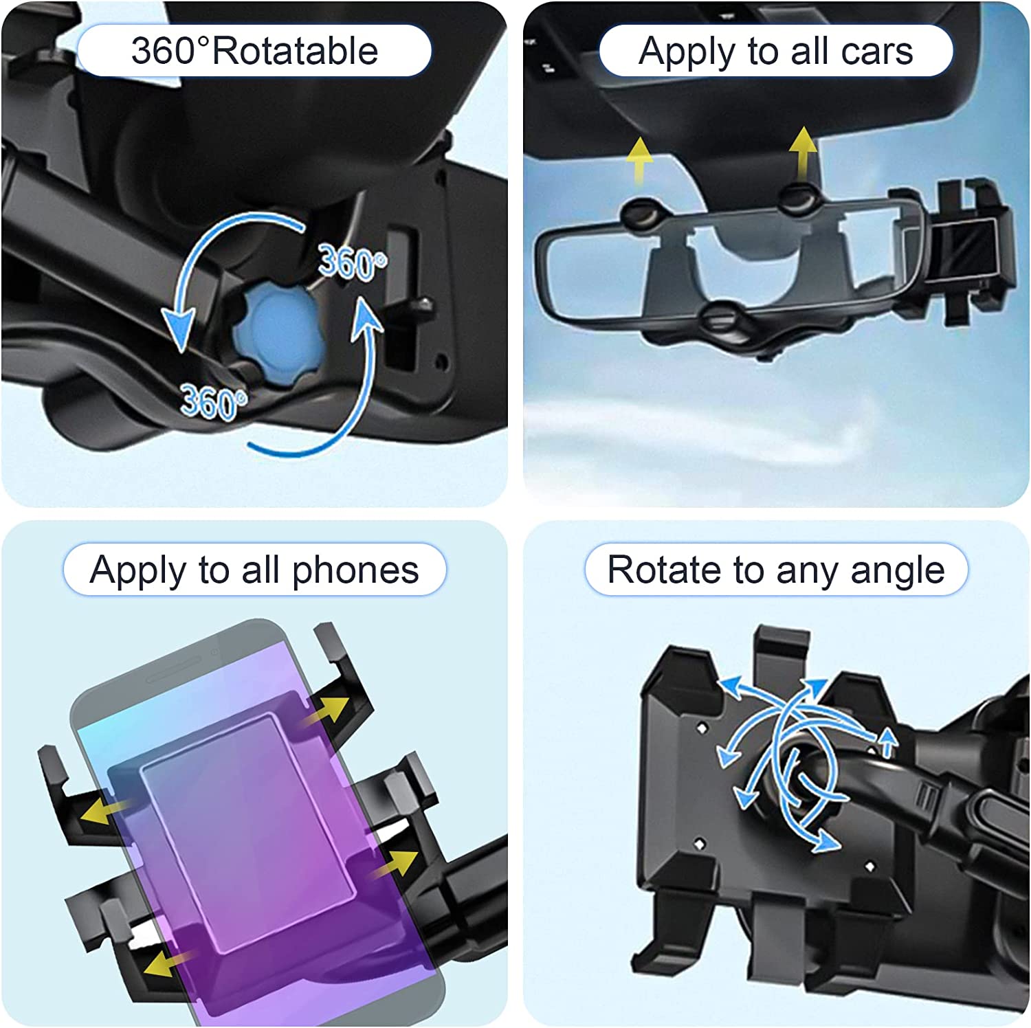 ROBUST AND DURABLE: The four-claw design of our rearview mirror accessories can firmly fix the phone in place no matter how rough the road is. Suitable for all mobile phones and all models.