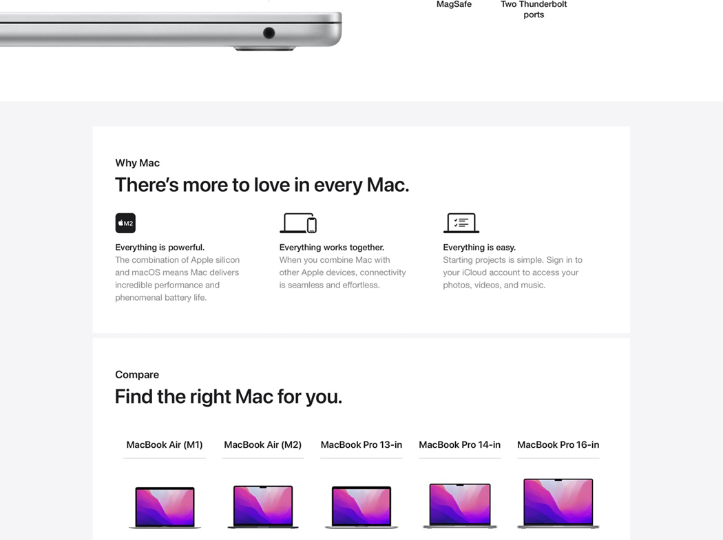 • VERSATILE CONNECTIVITY — MacBook Air features a MagSafe charging port, two Thunderbolt ports and a headphone jack.