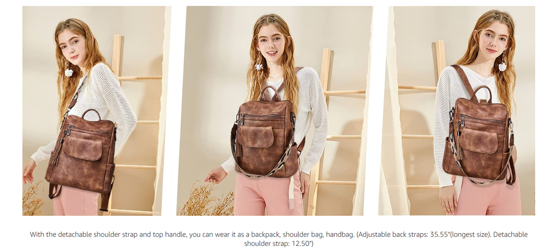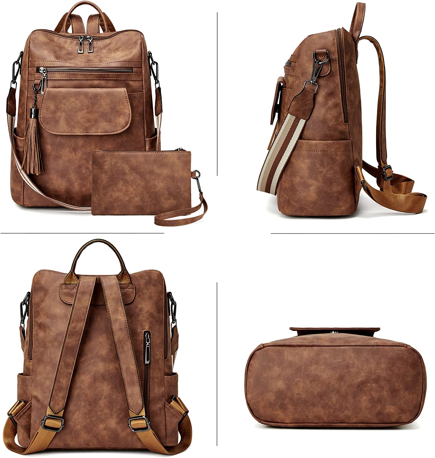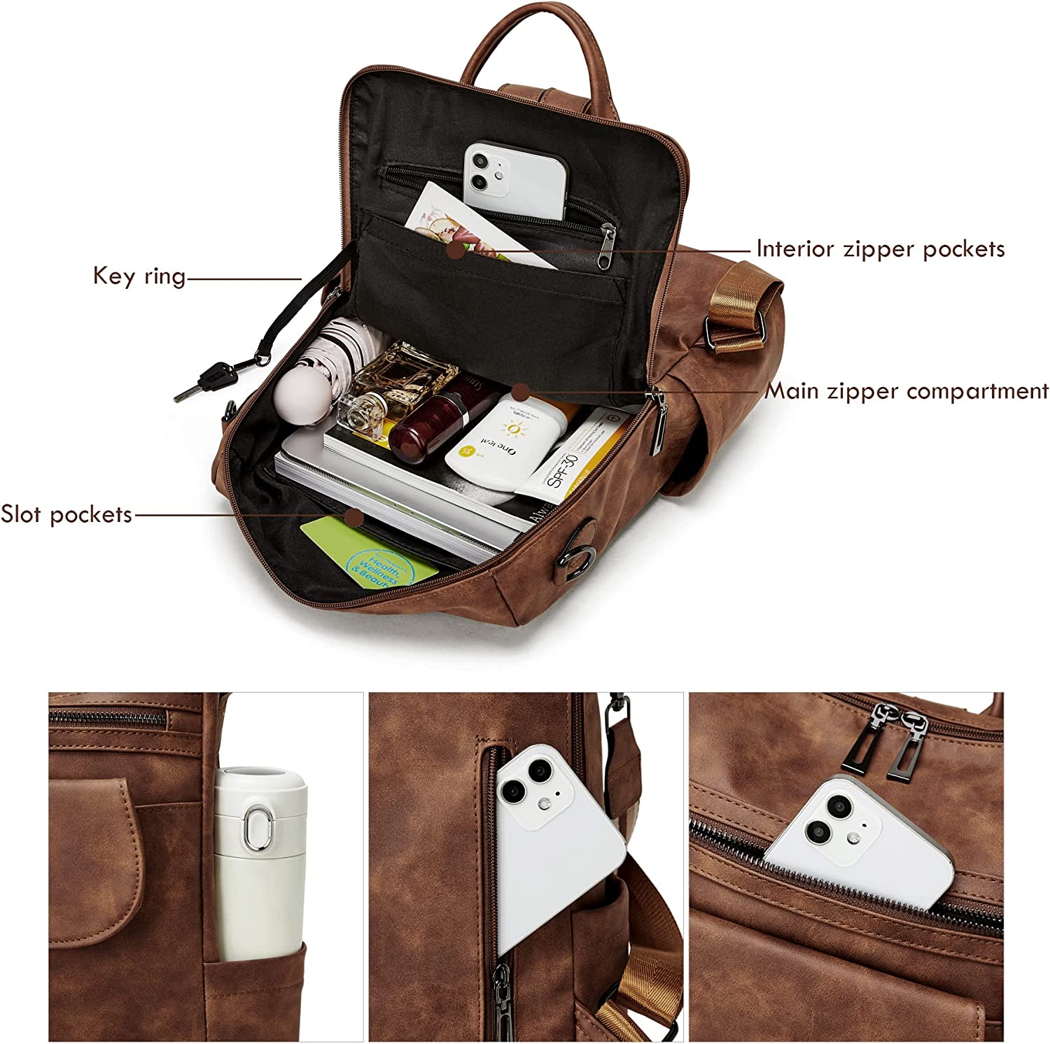 【LARGE CAPACITY】This leather backpack purse for women adopts a large vertical opening at the top, which is very convenient for loading items. 1 inner zipper pockets, 2 inner slot pockets, 2 front pockets, 2 side pockets, and 1 back zipper pocket. The extra wristlet provides more compartments. Multiple pockets can keep your things well organized.