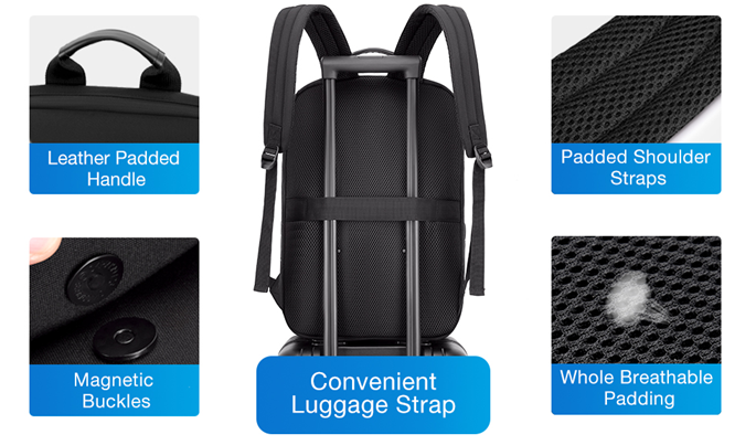 Portable Design - The charging port is convenient to charge your cell phone by the connected power bank. The magnetic buckles design of the flip cover makes it easier to open the backpack; luggage strap keeps the bag fastened to your suitcase when on the go; metal double-way zippers make opening/closing simple and fast.(POWER BANK IS NOT INCLUDED)