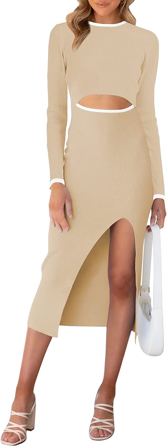 Cutiefox Women's Long Sleeve Cut Out Dress Side Slit Ribbed Knit Bodycon Midi Dresses