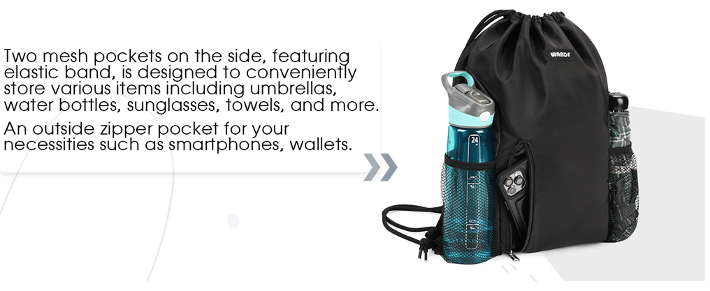 • LARGE CAPACITY--- WANDF drawstring backpack for men&women with large compartment measures 13.3" x 15.3", which is big enough for basketball, gym clothing, sport towel, ipad, textbooks and daily supplies. Two mesh side pockets can be used to hold your water bottle and umbrella.
