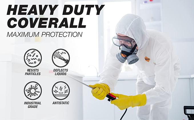 • INDUSTRIAL GRADE: Heavy duty coverall with elastic hood and cuffs, full booties, and reinforced zipper.