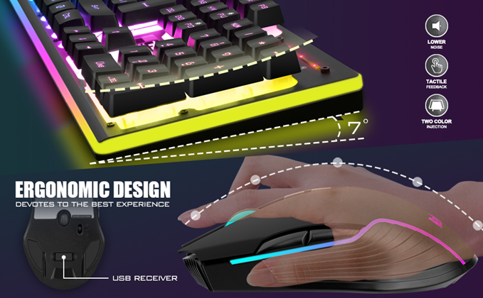 • 【Light Up Keyboard and Mouse】The keyboard has built-in three groups of rainbow backlight effects, supports 2 breathing modes, 3 static modes, and 4 brightness levels. The luminous design of Letters, logo, gaps and surroundings makes it the best light up wireless keyboard on the market (Note: There is no surrounding light in the right top corner due to the indicator light). The mouse has a built-in 7-color cyclic gradual lighting effect.