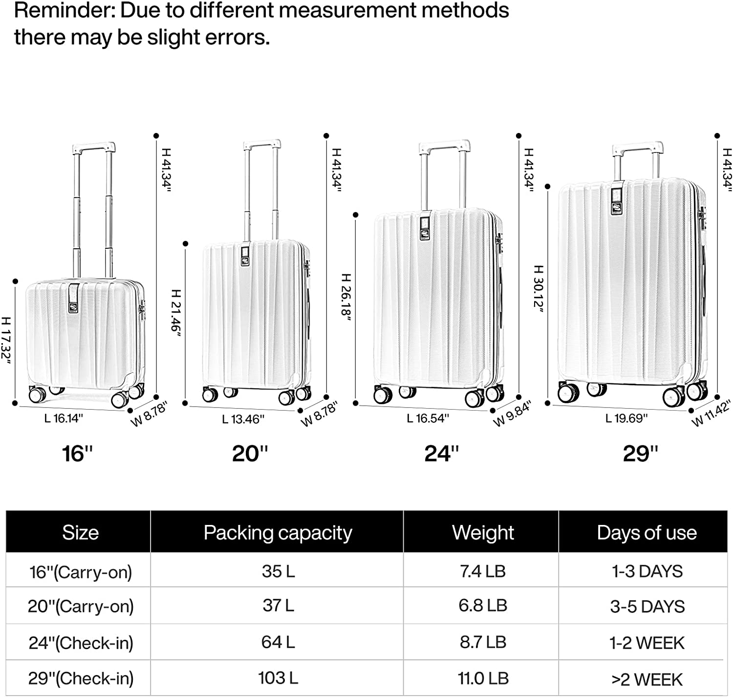 • 【Product dimensions】Including wheels and handles(can ont expandable),20 inch Carry on luggage airline approved : L13.46 x W8.78 x H21.46", 37L, 6.8LB,can fit in the overhead bin.