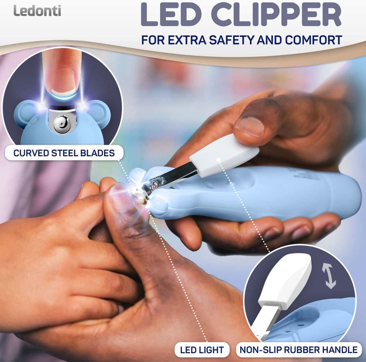 • ALL-IN-ONE BABY NAIL KIT for safe nail care of babies, kids, and their parents. Baby nail trimmer electric LED with 6 replaceable grinder heads and sandpapers. Safety clippers with curved steel blades and LED light. Ultra-safe scissors with a protective cap. A convenient storage bag. Get a professional nail care set for the whole family.