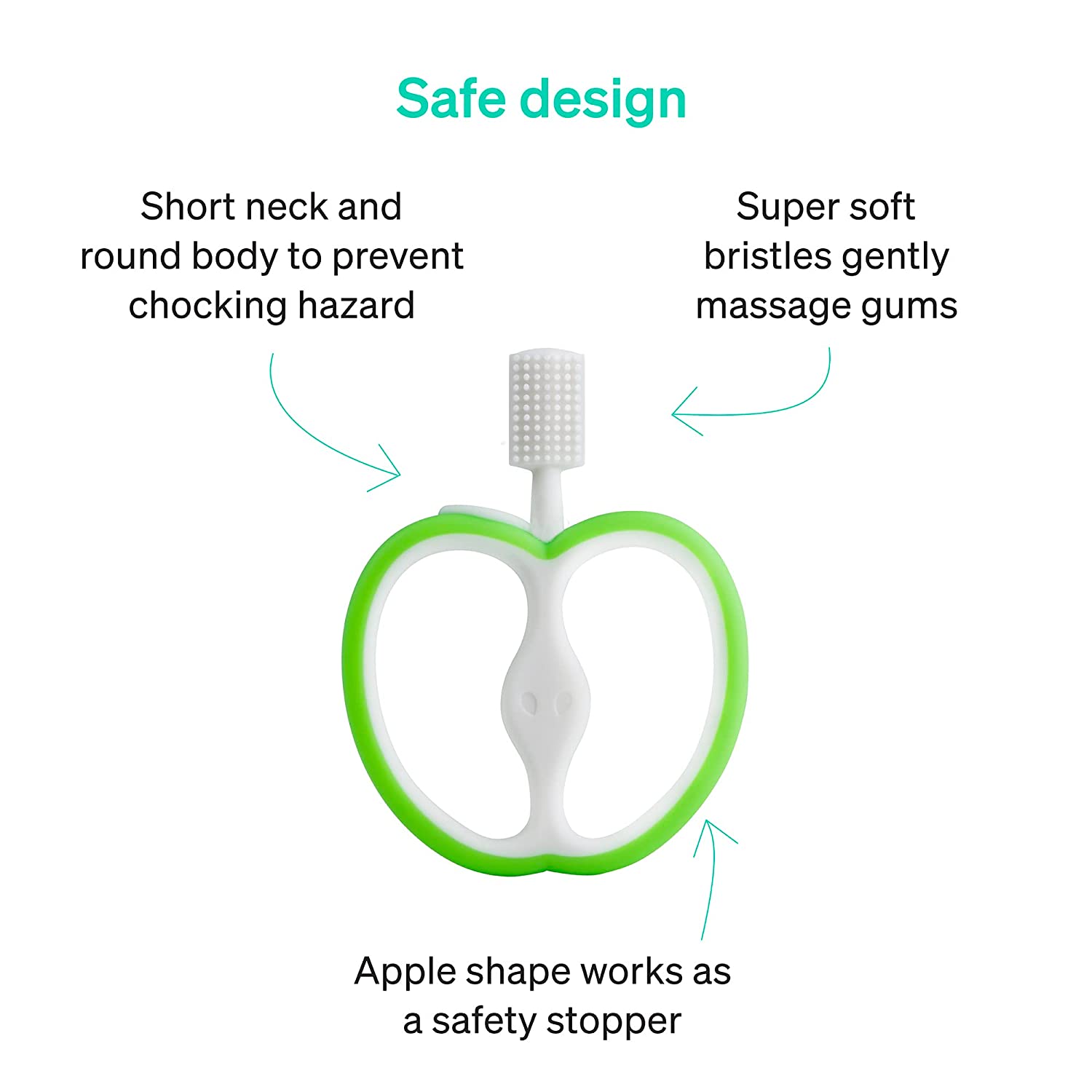 • The apple shaped handles work as a safety stopper and the short neck of the baby toothbrush prevents infant from putting the silicone teething toothbrush too deep. It’s also a great baby registry gift because sometimes parents don’t know what they need.