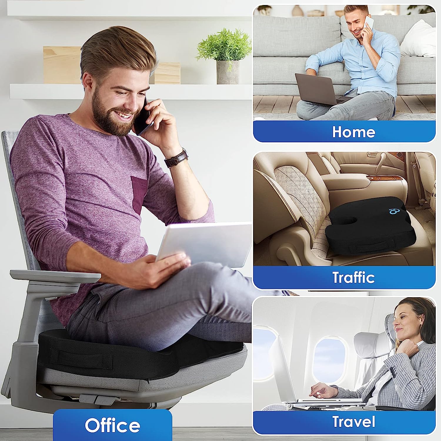 - 【Work with Any Chair】This ergonomic seat cushion provides comfort for people who sit in chairs and face screens all day. Great for office work, play games, watch movies, etc. If you travel by car, train or plane, but feel uncomfortable with the seat, this portable cushion will be your best travel partner. Bring extra comfort to your office, car, or chair!