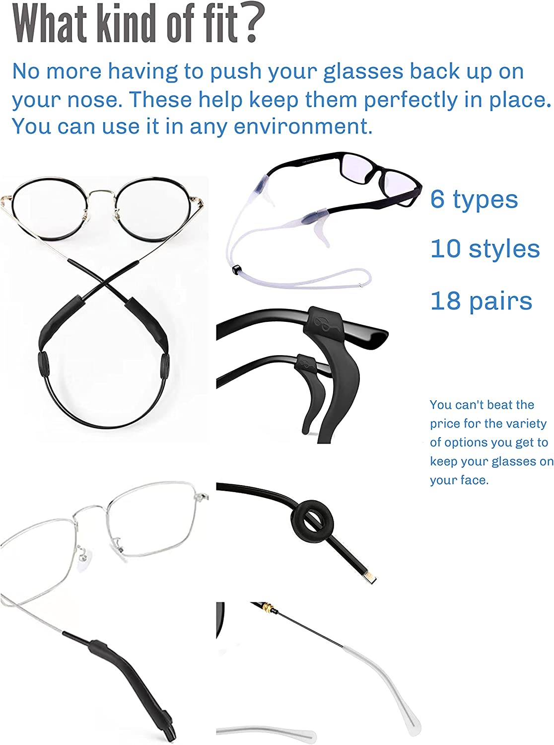 ?Safety Eyewear Retainers:we have 6 types 10 styles 18 pairs 34pcs (black and white),2 pairs x Sports Glasses straps,4 pairs x Eyeglass Ear Grip Hook,4 pairs x Eyeglass Ear Grip Hook (round),4 pairs x Eyeglasses Temple Tips Sleeve Retainer,4 pairs x Anti-Slip Silicone Eyeglass End Tips
