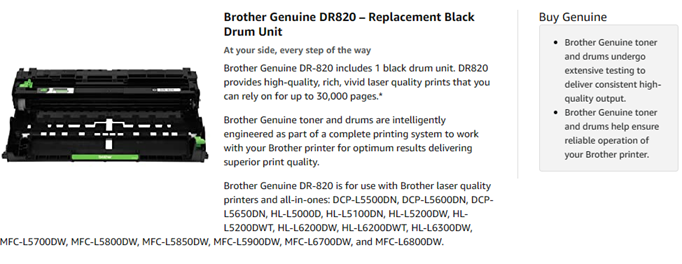 Business professionals who have invested money in high-quality Brother products expect the same from replacement supplies. The Brother Genuine DR-820 Mono Laser Drum Unit is a replacement drum for use with 16 different Brother printers and all-in-ones, intelligently engineered as part of a complete printing system. These genuine replacement Drum Units are produced with precision to deliver sharp, text and graphics with every page printed. The DR-820 drum unit yields approximately 30,000 pages(1) when used with Brother Genuine toner cartridges (sold separately).