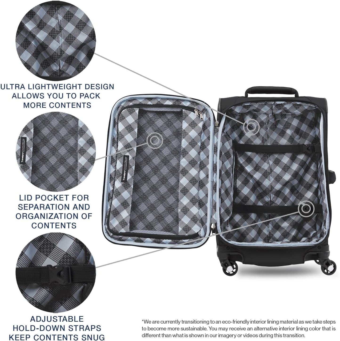 This carry-on soft-sided spinner is so light, it flies; one of our lightest wheeled carry-on suitcases, the Maxlite 5 21" expandable spinner is designed for ultimate comfort and mobility, featuring a 2-position adjustable PowerScope lite handle with patented Contour grip and 4-wheel 360 degree rotating spinners that glide effortlessly. Enjoy packing convenience with two quick-access, exterior front pockets, full-length interior lid pocket, side accessory pocket and adjustable hold-down straps, while the high-tensile-strength expandable zipper gives you maximum packing flexibility. Backed by a new and expanded trusted traveler promise-for worry-free warranty coverage from Travelpro.
