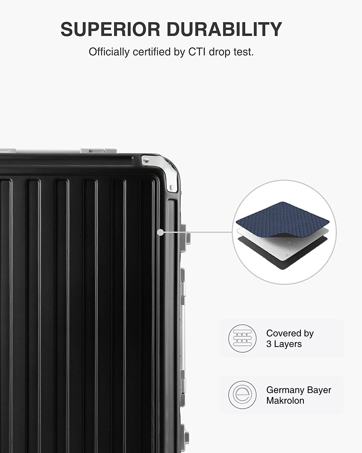 HIGH-END MATERIALS - This carry on luggage with spinner wheels is made of lightweight Polycarbonate uniting the resilient aluminum frame with no zipper design. Providing long-lasting and comfortable usage.
