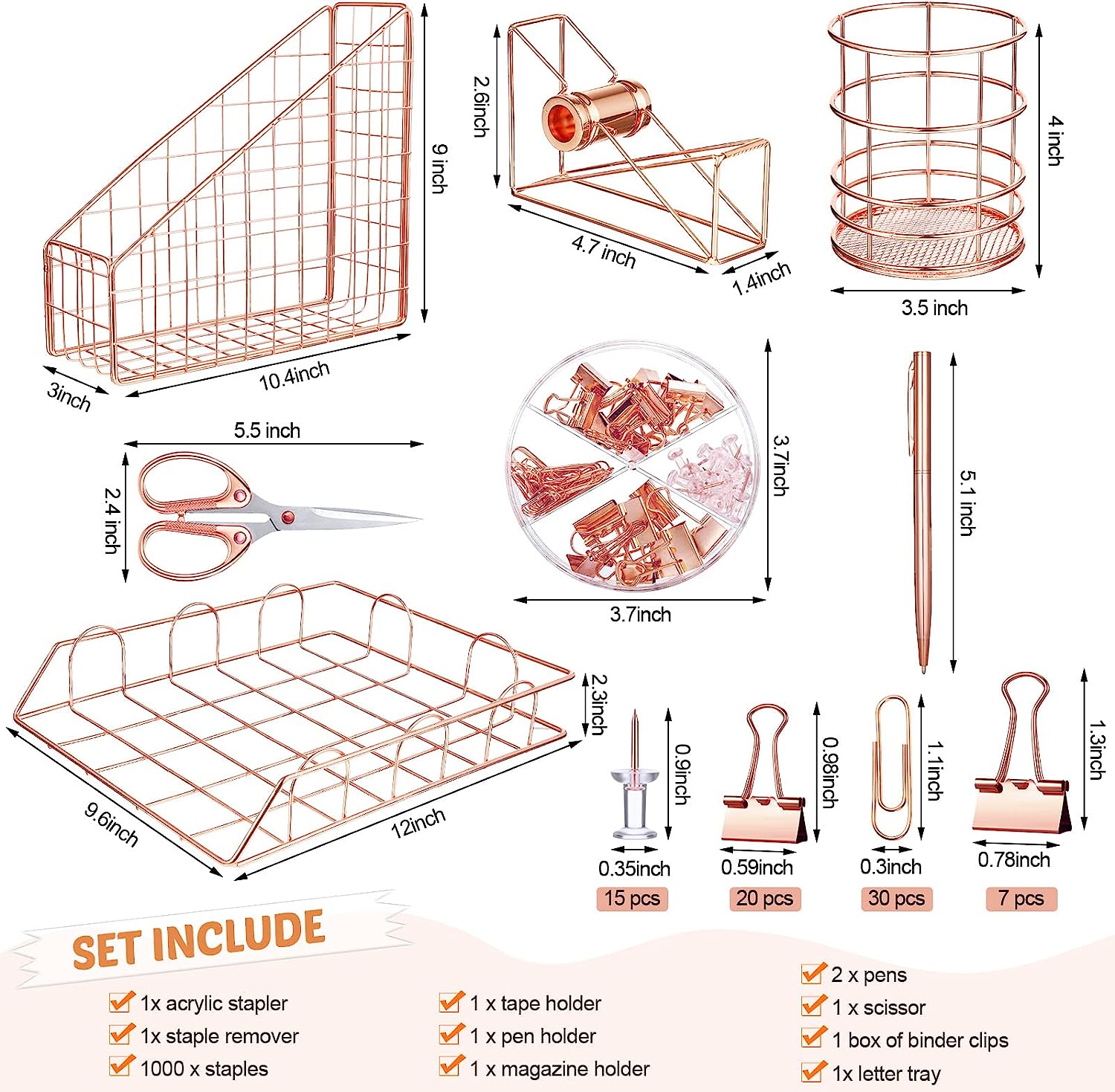 - Nice Combination: you will receive 1 piece of file holder, 1 piece of magazine file organizer, 1 piece of acrylic stapler, 1 piece of staple remover, 1000 pieces of staples, 1 piece of tape dispenser, 1 piece of pen holder, 2 pieces of pens, 1 pair of scissor, and 1 box of binder clips; The rose gold office supplies set can meet your daily and work needs, keeping your desk or desk drawer organized