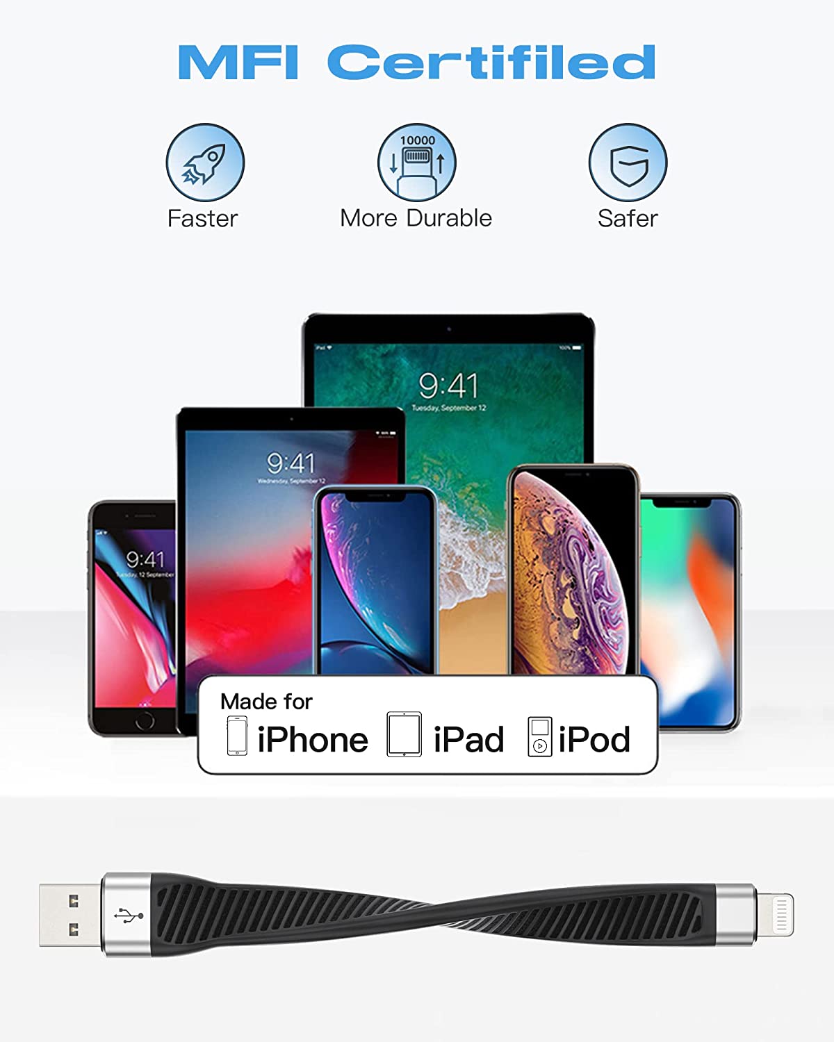 • 【Fast Charging & Data Sync】:MFi Certified LamToon iphone charge cable use C189 design for fast charging. Supports safe high-speed charging (2.4A) and fast data sync (480Mbps)