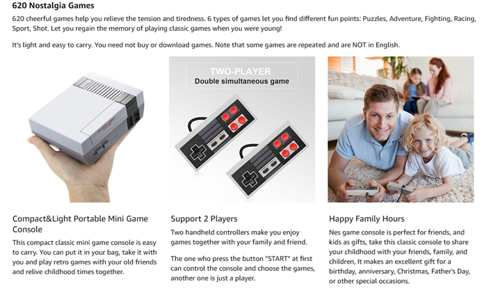 - ? Happy Sharing,Good Gift : The classic retro game console can give you the opportunity to share your happiness with friends,wife and husband.This would be a great holiday gift,birthday gift for kids and friends who love retro games.