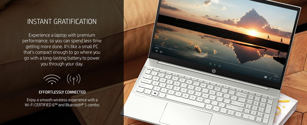 The HP Pavilion 15 Laptop has all the performance for mind-blowing entertainment you enjoy, but in a smaller, lightweight PC. The Full HD, IPS, micro-edge display combines with audio by BandO to give you robust, authentic theater-level entertainment (1). Intel Iris Xe Graphics (2) delivers the impressive performance needed for your creating, gaming, and entertainment while the 11th Generation Intel Core i7-1165G7 processor (3) gives you the instant responsiveness and best-in-class connectivity modern users crave. The HP Pavilion laptop’s 512 GB PCIe NVMe M.2 SSD storage outclasses traditional hard drives with 15 times the performance (4). Experience improved multitasking thanks to 16 GB of RAM. Work all day with up to 8 hours of battery life (5) and go from 0 to 50% charge in approximately 45 minutes with HP Fast Charge (6). Windows 10 Pro blends seamlessly and powerfully with this HP 15 Laptop for an optimized computing experience (7). Get more done with solid connection speeds from the powerful Wi-Fi 6 (2x2) (9) and Bluetooth 5.0 combo (10) and work comfortably with the familiar feel of a full-sized keyboard. Your HP laptop checks all the boxes with a 1-year limited hardware warranty, ENERGY STAR certification (12), EPEAT Silver registered (13), and a low halogen display (14). (1) Full High Definition (FHD) content is required to view FHD images. (2) Shared video memory (UMA) uses part of the total system memory for video performance. System memory dedicated to video performance is not available for other use by other programs. (3) Multi-core is designed to improve the performance of certain software products. Not all customers or software applications will necessarily benefit from the use of this technology. Performance and clock frequency will vary depending on the application workload and your hardware and software configurations. Intel’s numbering, branding, and/or naming is not a measurement of higher performance. Intel, Pentium, Intel Core, Celeron, Iris Xe, Intel logo, and the Intel Inside logo are trademarks of Intel Corporation in the U.S. and other countries. (4) Based on HP internal testing using CrystalDiskMark benchmarking software. Performance is sequentially faster (read-only) compared to traditional 5,400 rpm HDD. (5) Windows 10 MobileMark 18 battery life will vary depending on various factors including product model, configuration, loaded applications, features, use, wireless functionality, and power management settings. The maximum capacity of the battery will naturally decrease with time and usage. See bapco.com/products/mobilemark-2018/ for additional details. (6) Recharges your battery up to 50% within 45 minutes when the system is off (using “shut down” command). Recommended for use with the HP adapter provided with the notebook, not recommended with a smaller capacity battery charger. After charging has reached 50% capacity, charging speed will return to normal speed. Charging time may vary plus/-10% due to System tolerance. (7) Not all features are available in all editions or versions of Windows. Systems may require upgraded and/or separately purchased hardware, drivers, software, or BIOS update to take full advantage of Windows functionality. Windows 10 is automatically updated, which is always enabled. ISP fees may apply and additional requirements may apply over time for updates. See microsoft.com (8) Upgrade rollout plan is being finalized and is scheduled to begin late in 2021 and continue into 2022. Specific timing will vary by device. Certain features require specific hardware, see http://www.Microsoft.com/windows/windows-11-specifications (9) Wireless access point and internet service required and sold separately. Availability of public wireless access points limited. Wi-Fi 6 (802.11ax) is backwards compatible with prior 802.11 specs. The specifications for Wi-Fi 6 are draft and are not final. If the final specifications differ from the draft specifications, it may affect the ability of the notebook to communicate with other Wi-Fi 6 devices. Only available in countries where 802.11ax is supported. (10) Bluetooth is a trademark owned by its proprietor and used by Hewlett-Packard Company under license. (11) Based on Wi-Fi 5 80MHz and Wi-Fi 6 160MHz minimum requirements when transferring files between two devices connected to the same router. Requires a wireless router, sold separately, that supports 802.11ax (Wi-Fi 6). Only available in countries where 802.11ax is supported. (12) ENERGY STAR and the ENERGY STAR mark are registered trademarks owned by the U.S. Environmental Protection Agency. (13) Based on U.S. EPEAT registration according to IEEE 1680.1-2018 EPEAT. EPEAT status varies by country. (14) External power supplies, power cords, cables, and peripherals are not Low Halogen. Service parts obtained after purchase may not be Low Halogen.