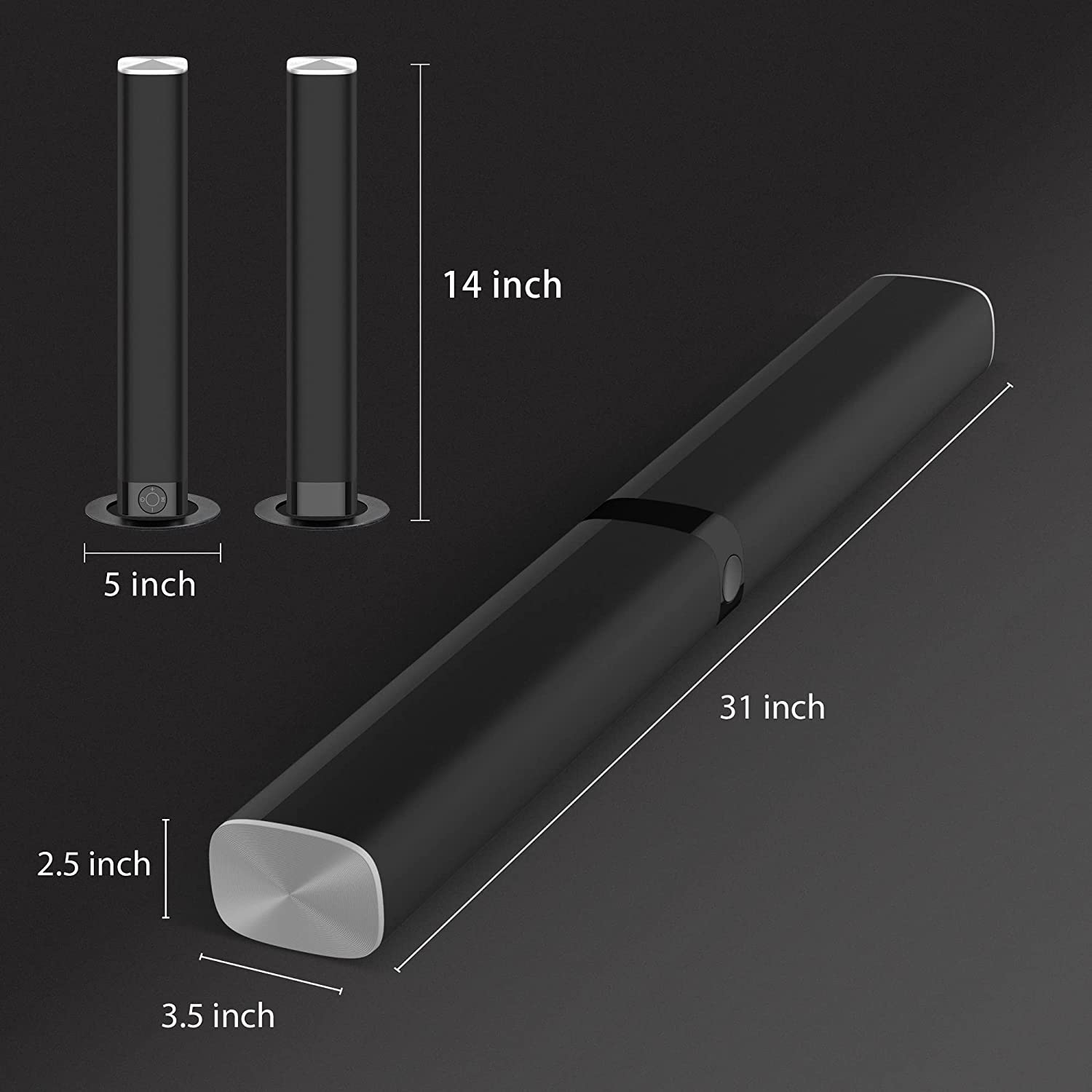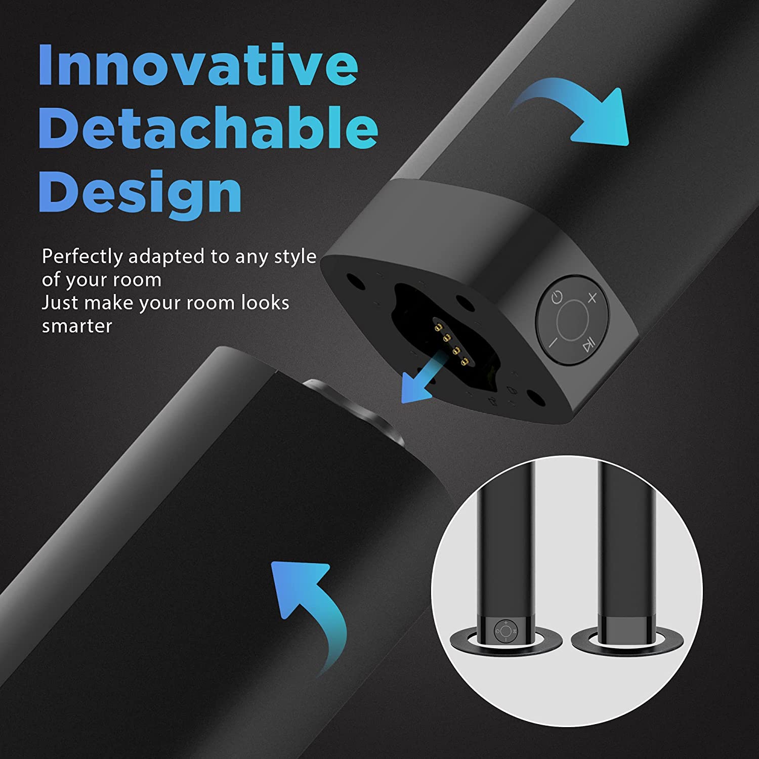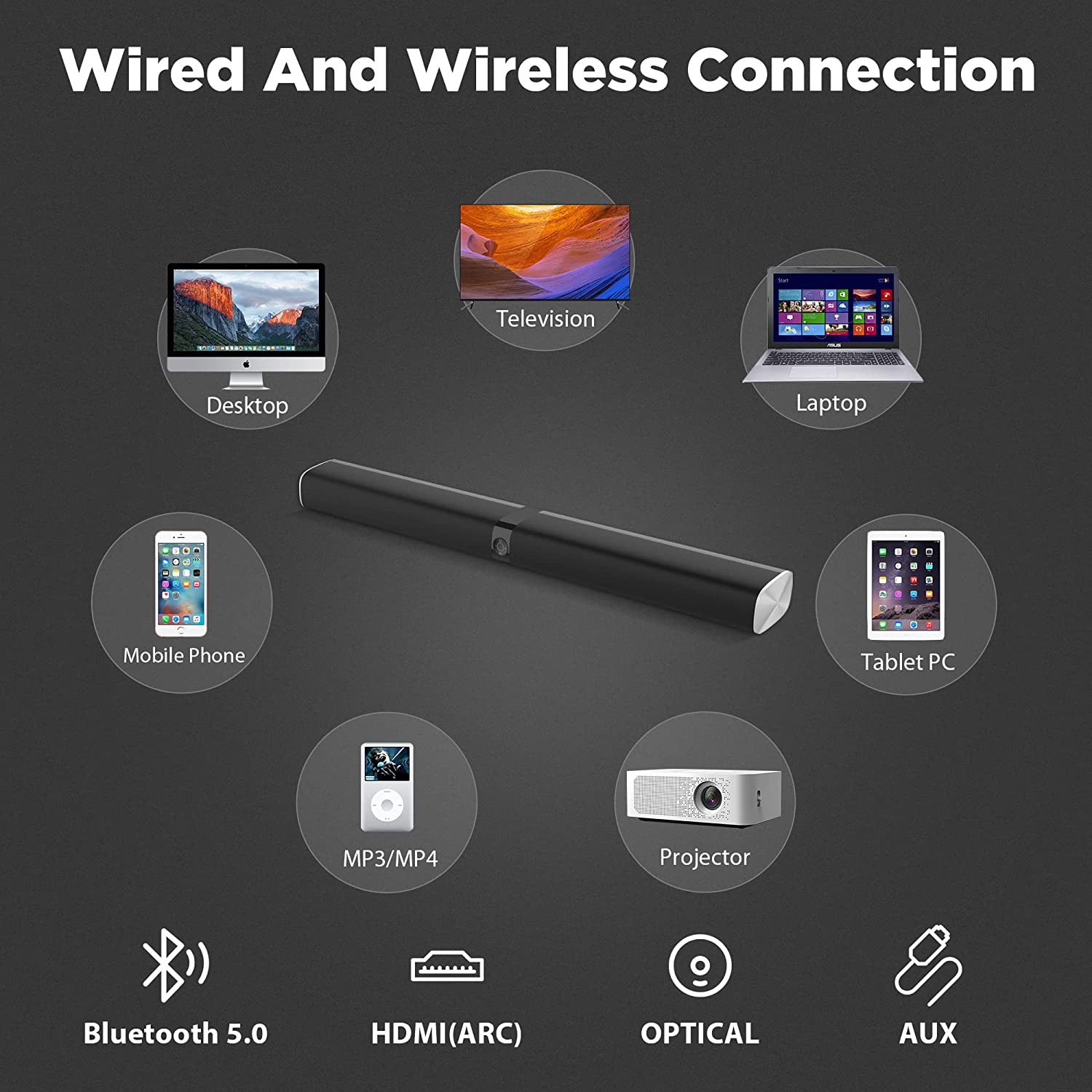 【Multiple Wired Connections+ 2 in 1 Detachable Design】: Optical/HDMI/AUX connections for almost devices. Innovative Detachable Design - Splits into 2 stereo soundbars and attaches to a base, space saving, retro and elegant, a great addition to your room.