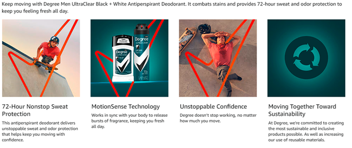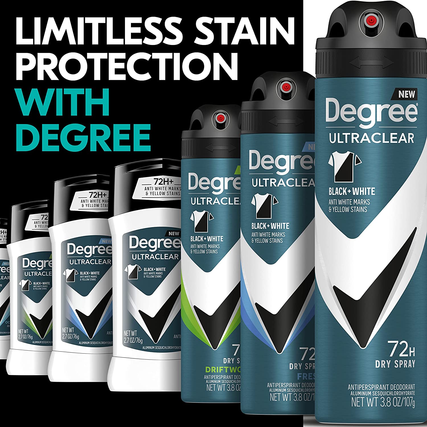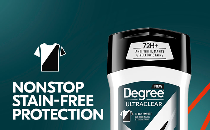 Degree Men UltraClear Black + White Antiperspirant Deodorant with long-lasting MotionSense® technology is specially designed to keep your clothes looking new. No white marks on black clothes and no yellow stains on white clothes. You'll look great all day and free from deodorant stains. This antiperspirant for men has a formula that cuts down on the stains that some antiperspirants leave behind when they mix with sweat and natural oils produced by your body. It also provides 72-hour sweat and odor protection to keep you moving and free to live life to its fullest. This antiperspirant deodorant stick also contains Degree's innovative MotionSense® technology. It works like this: unique microcapsules sit on the surface of your skin. When you move, friction breaks those microcapsules, and they release more fragrance. So, every time you move, Degree keeps you fresh and free from odor. This antiperspirant deodorant stick works as hard as you do, keeping you protected, so you can keep moving and stay active. Simply glide and get moving. At Degree, we're doing everything we can to help keep the planet moving.