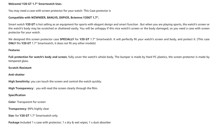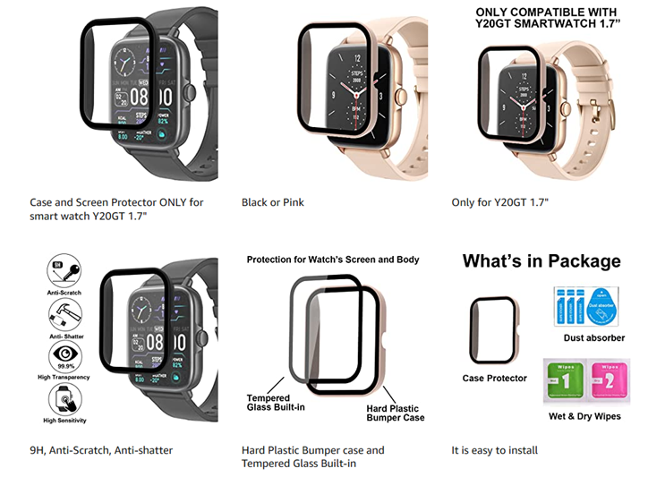 • Watch Case with Screen Protector Build-in is ONLY for Y20GT, compatible with WZWNEER, BANLVS, DXPICR, Bctemno Y20GT 1.7” Smartwatch ONLY, you must make sure your watch model number is same