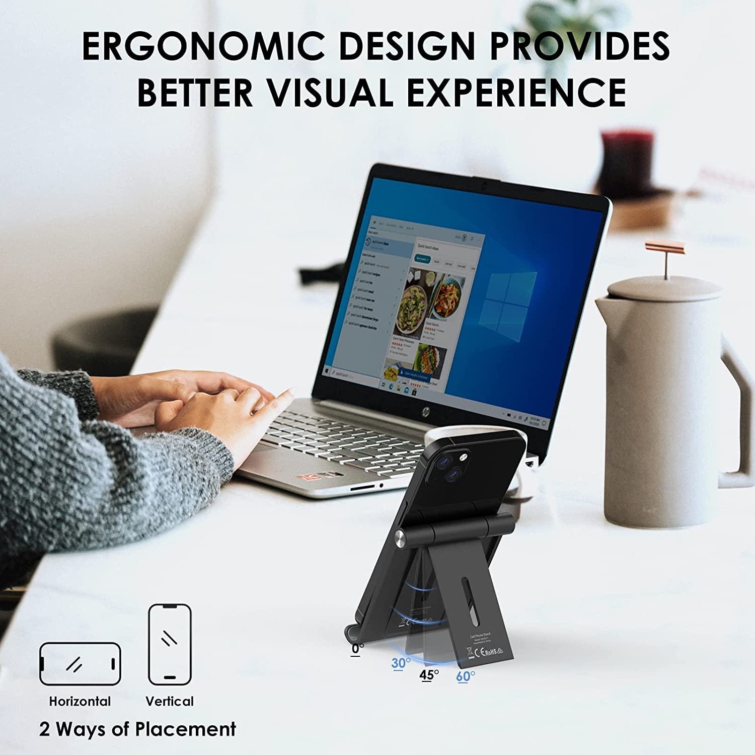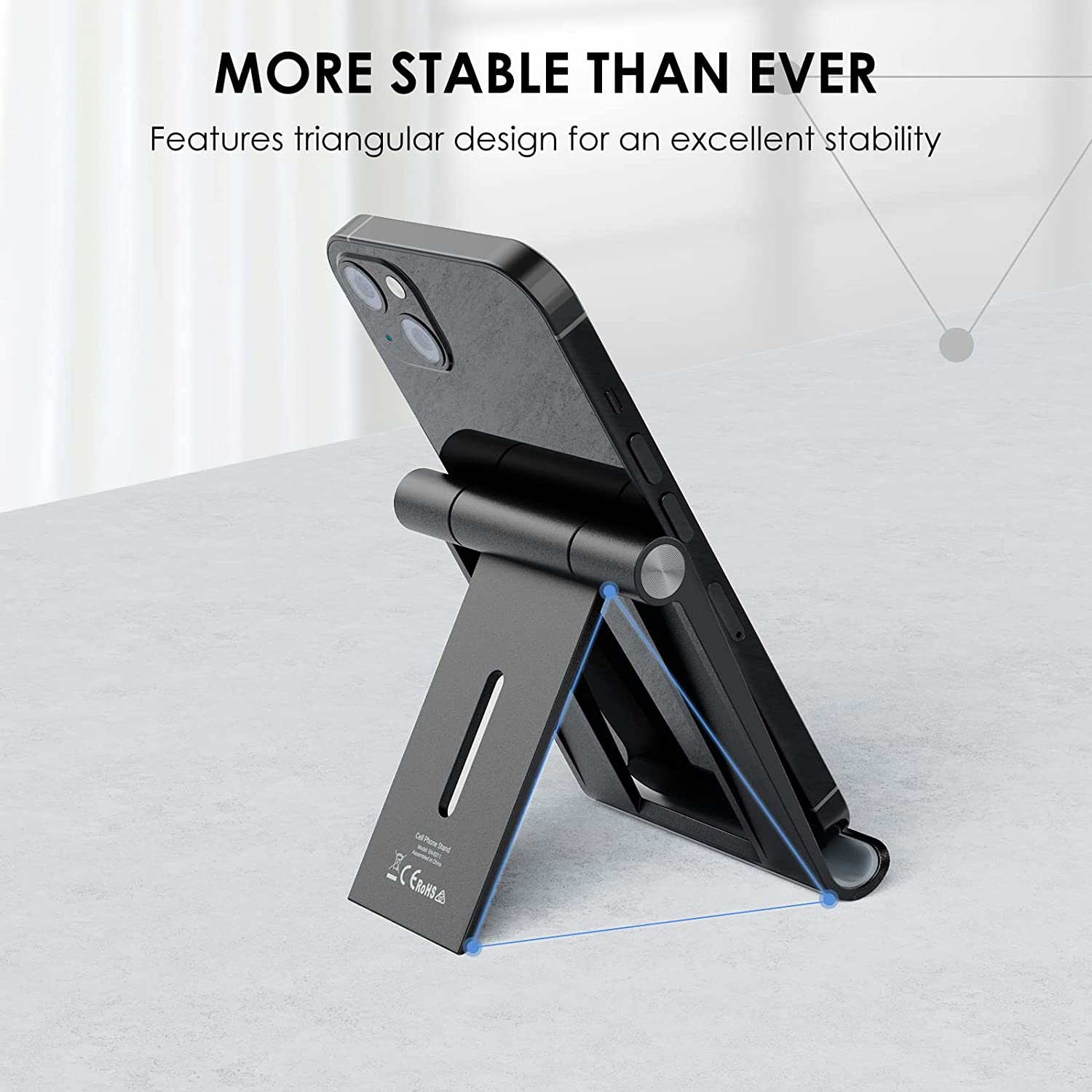 Minthouz Adjustable Cell Phone Holder for Desk - Foldable Phone Stand Compatible with iPhone 14 13 12 Pro Max Mini 11 Xr 8 Plus SE, iPad Mini, Switch, Android Smartphone, Tablets - Black