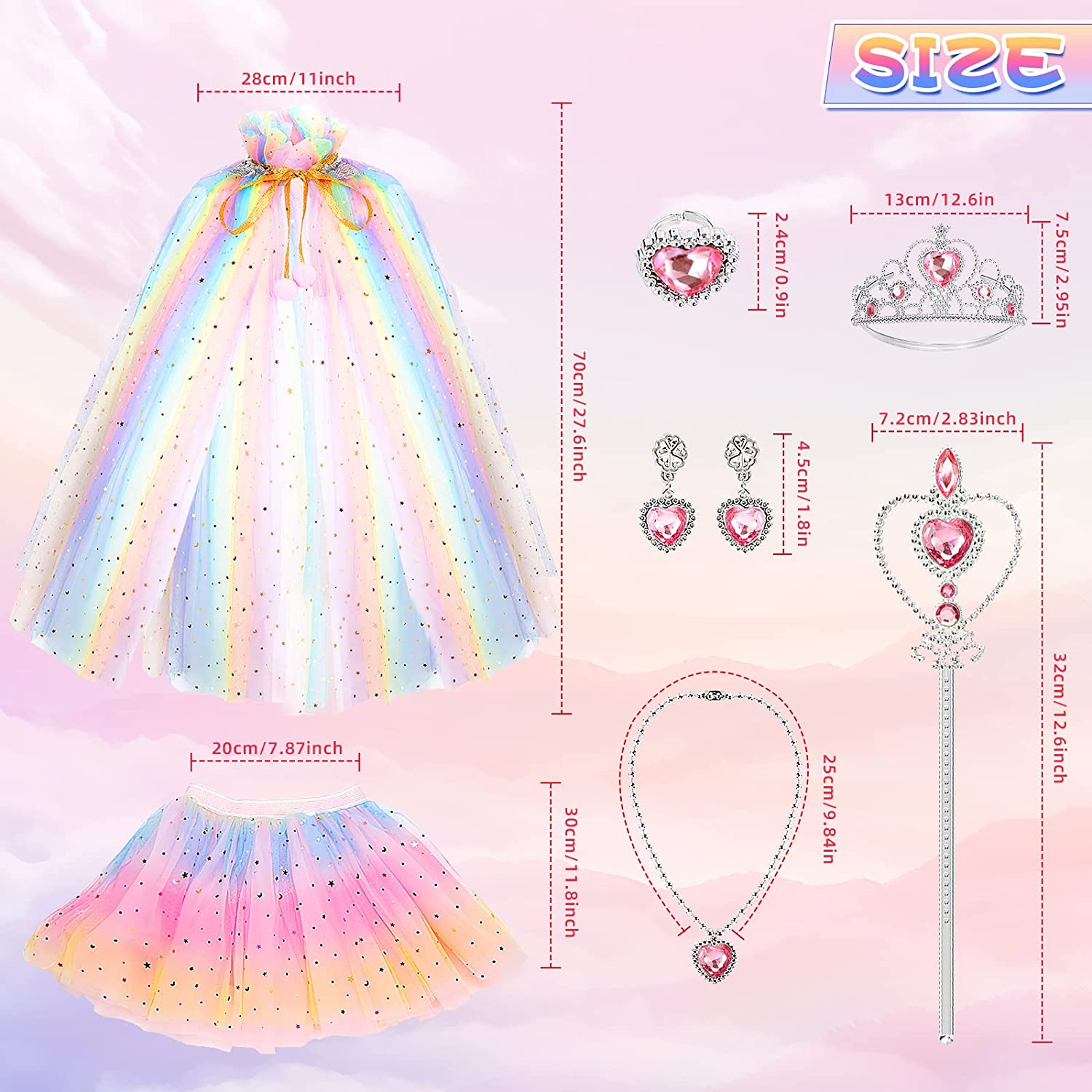 Princess Girls Dress Up Set: Comes with everything a little girl person needs to become a princess! It includes princess cape,princess dress,princess crown tiara, princess wand, earring, ring, necklace. Available in various colors such as:Snowflake Blue,Fairy Pink, Mermaid Purple,Rainbow Unicorn Costume...Recommended Ages: 3-8 Years.
