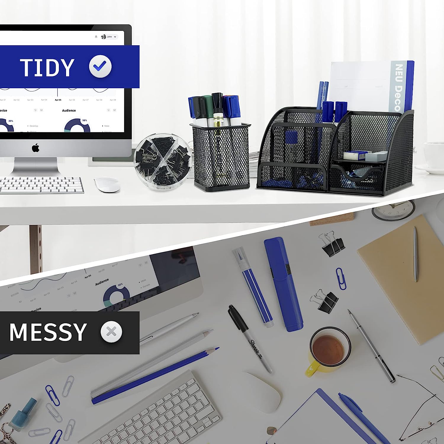 Our Mesh Desk Organizer Caddy with Drawer features six compartments, a pen holder, and a drawer to keep all of your office supplies in one convenient location. Plus, our set includes 72 Paper Clips and Binder Clips in a sleek black finish to help keep your documents organized.