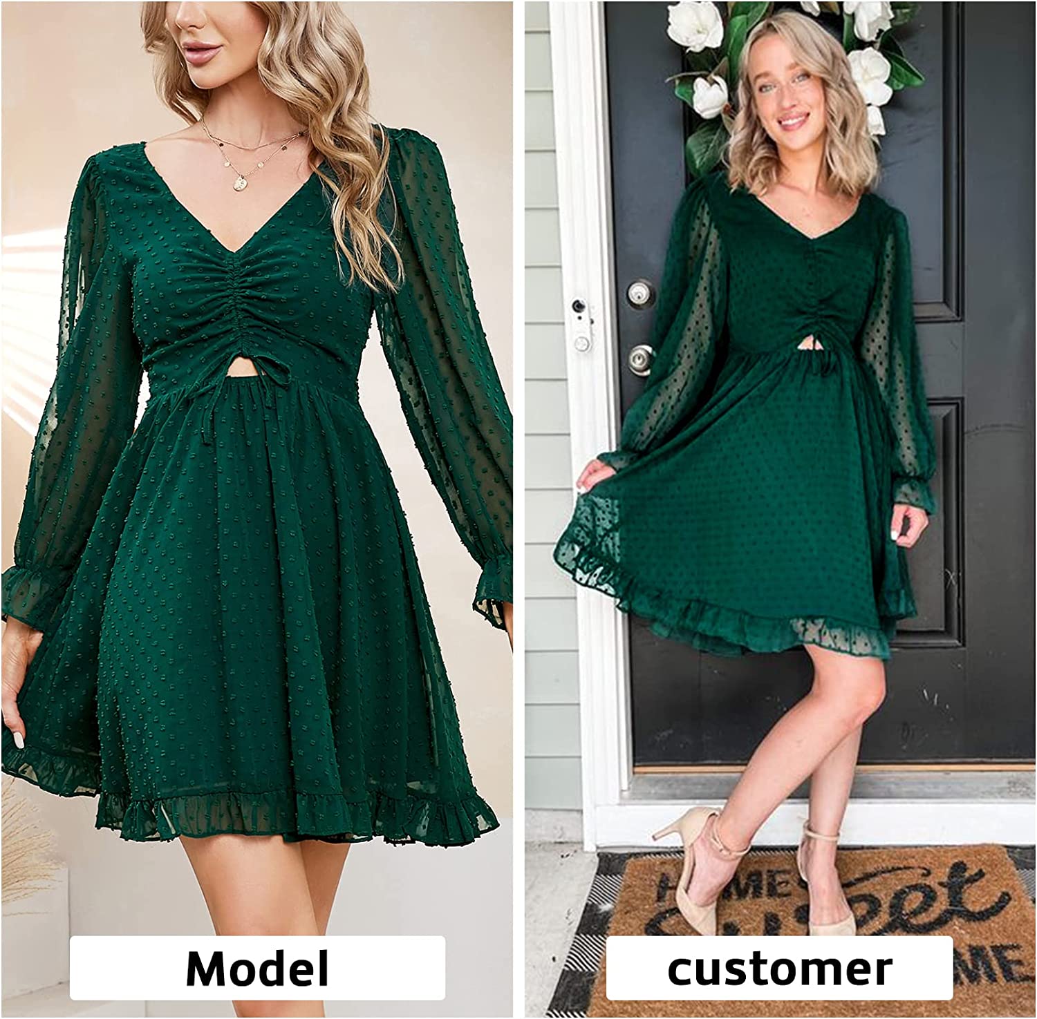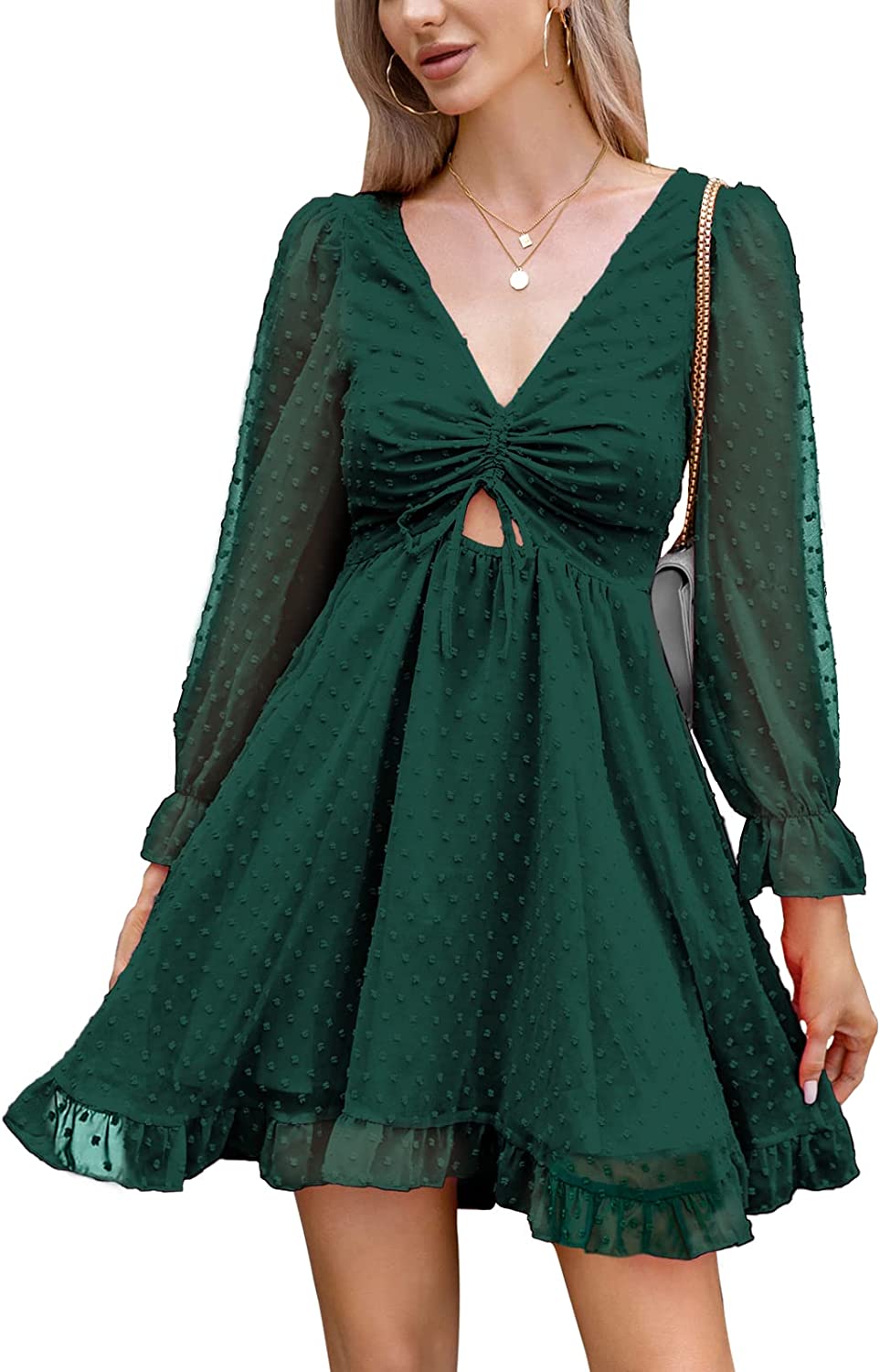 • Design: v neck, puff long sleeve, ruffle cuff, drawstring, ruched front, cutout, smocked waistband, A line, frill hem, flowy swing dress, backless, tie back, Swiss dot, mini dress